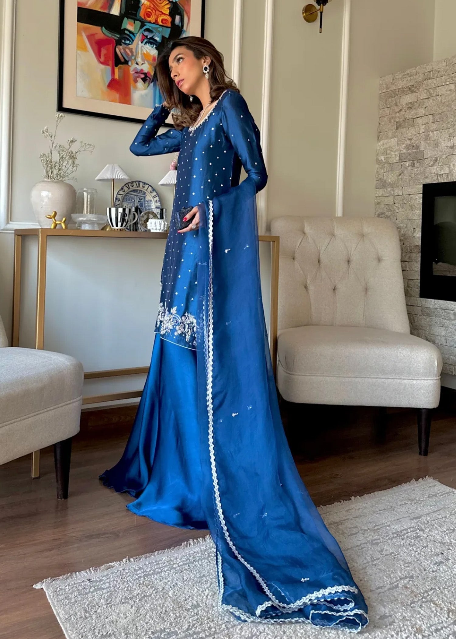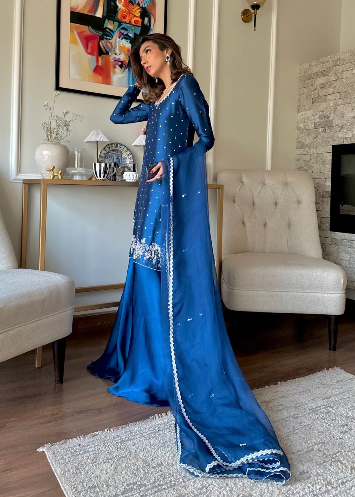 A commanding blue silhouette featuring delicate embellishment and fluid movement. Styled with wide-leg pants and a coordinating organza dupatta, this look balances structure with elegance.