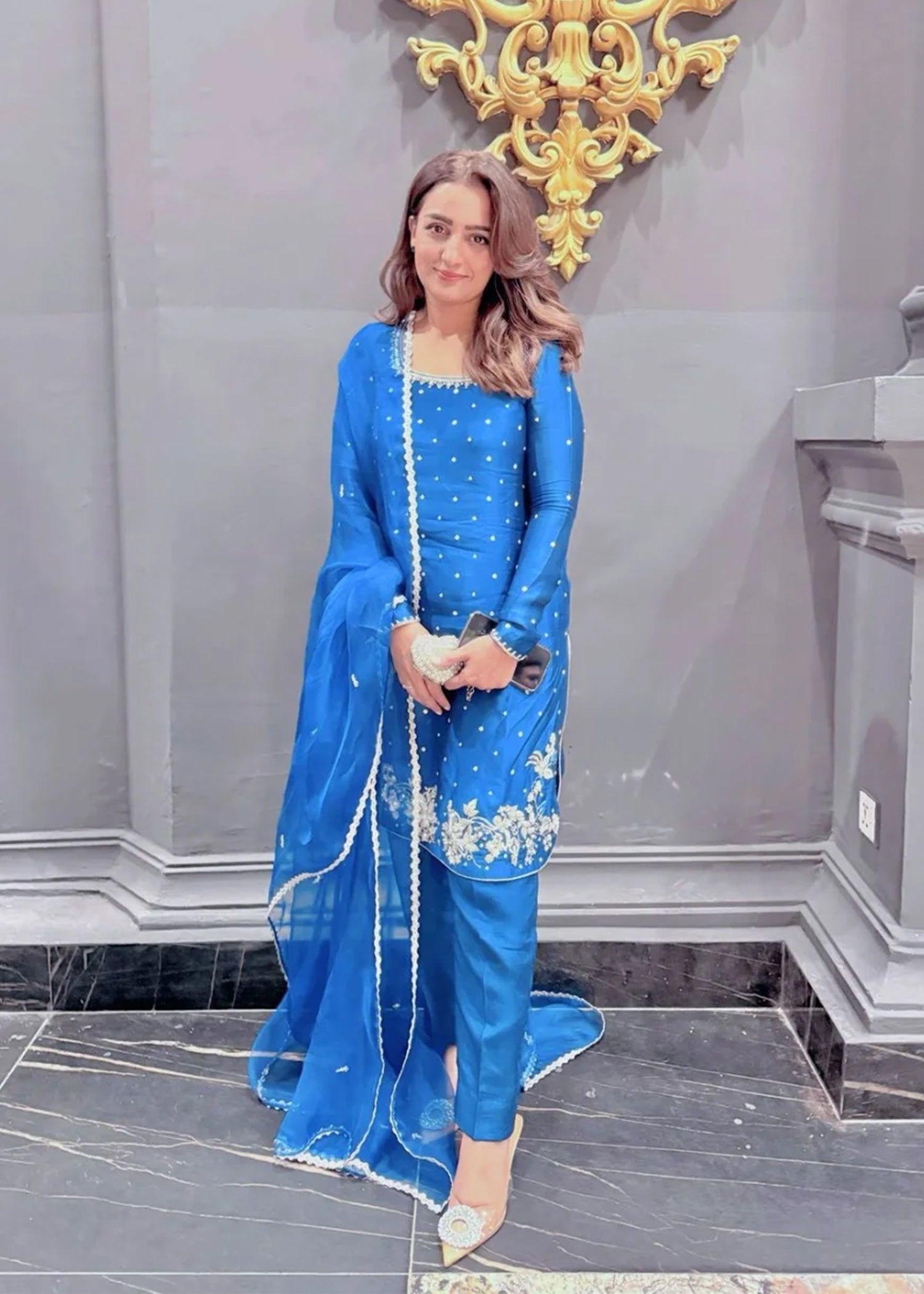 A commanding blue silhouette featuring delicate embellishment and fluid movement. Styled with wide-leg pants and a coordinating organza dupatta, this look balances structure with elegance.