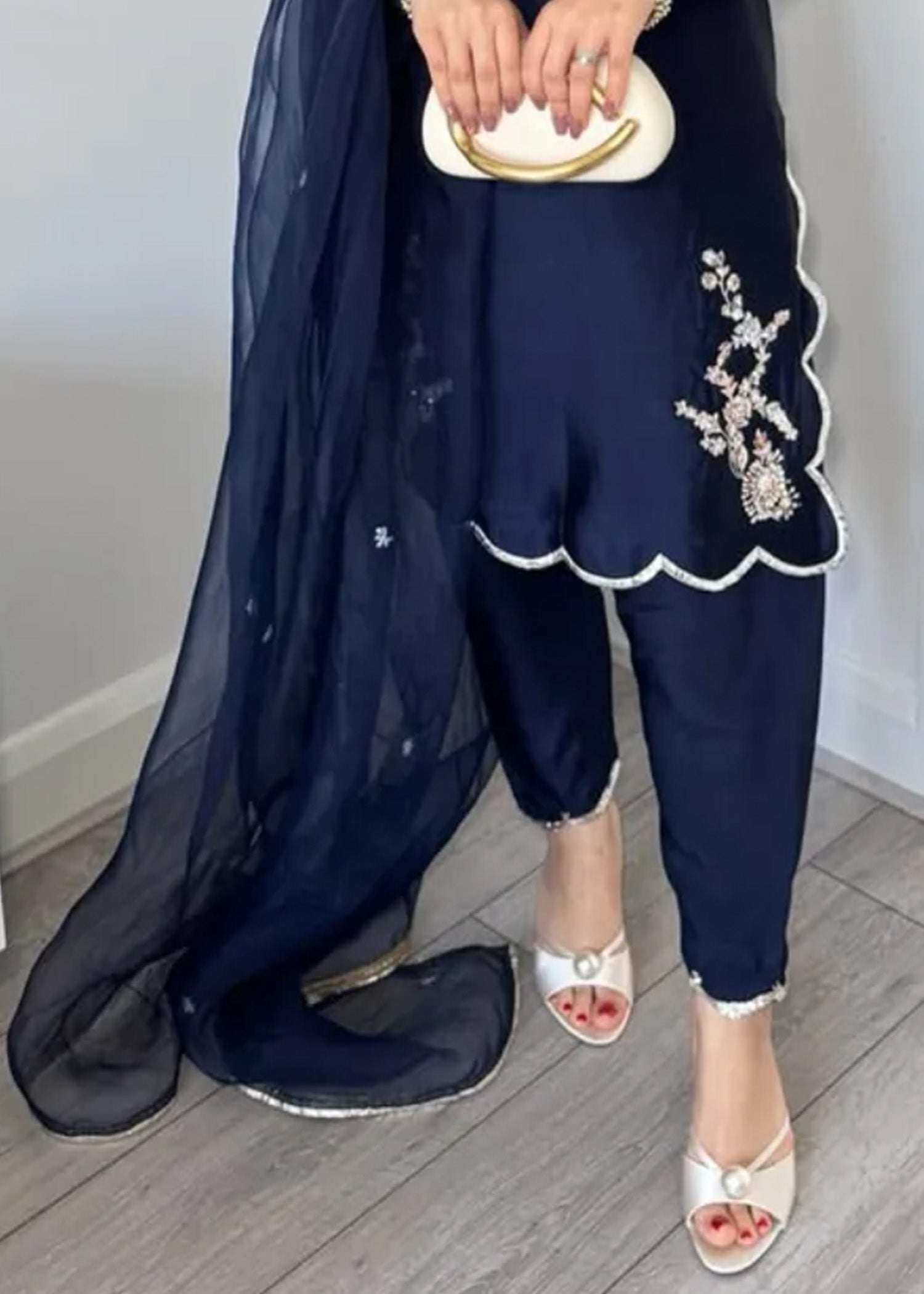 "Diva" is a chic, minimalist silhouette with intricate Ganga Jamni work at the front, featuring a khari shalwar with scalloped finishing. It's paired with an elegant organza dupatta, beautifully adorned with delicate booti work, creating a refined and stylish ensemble.