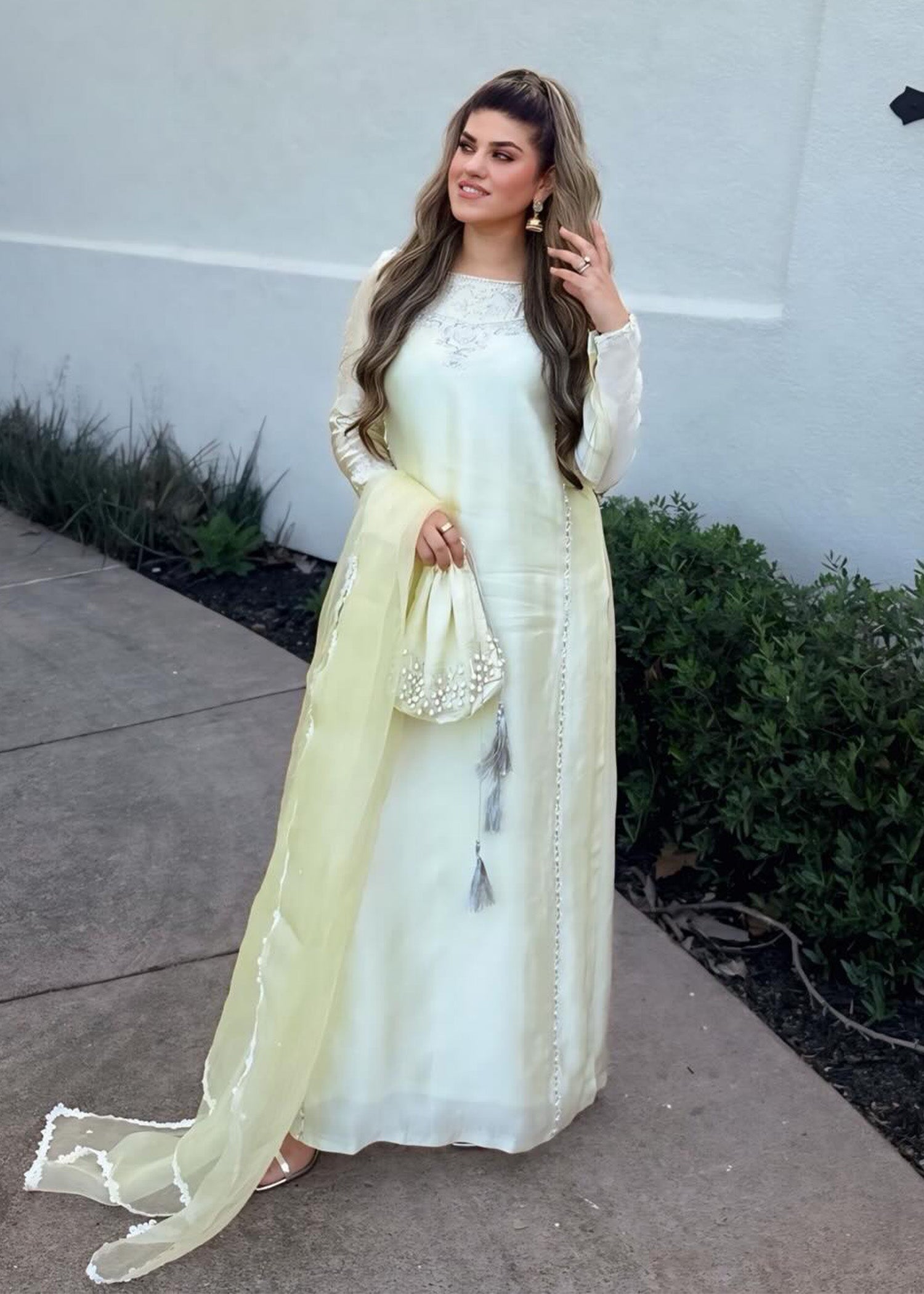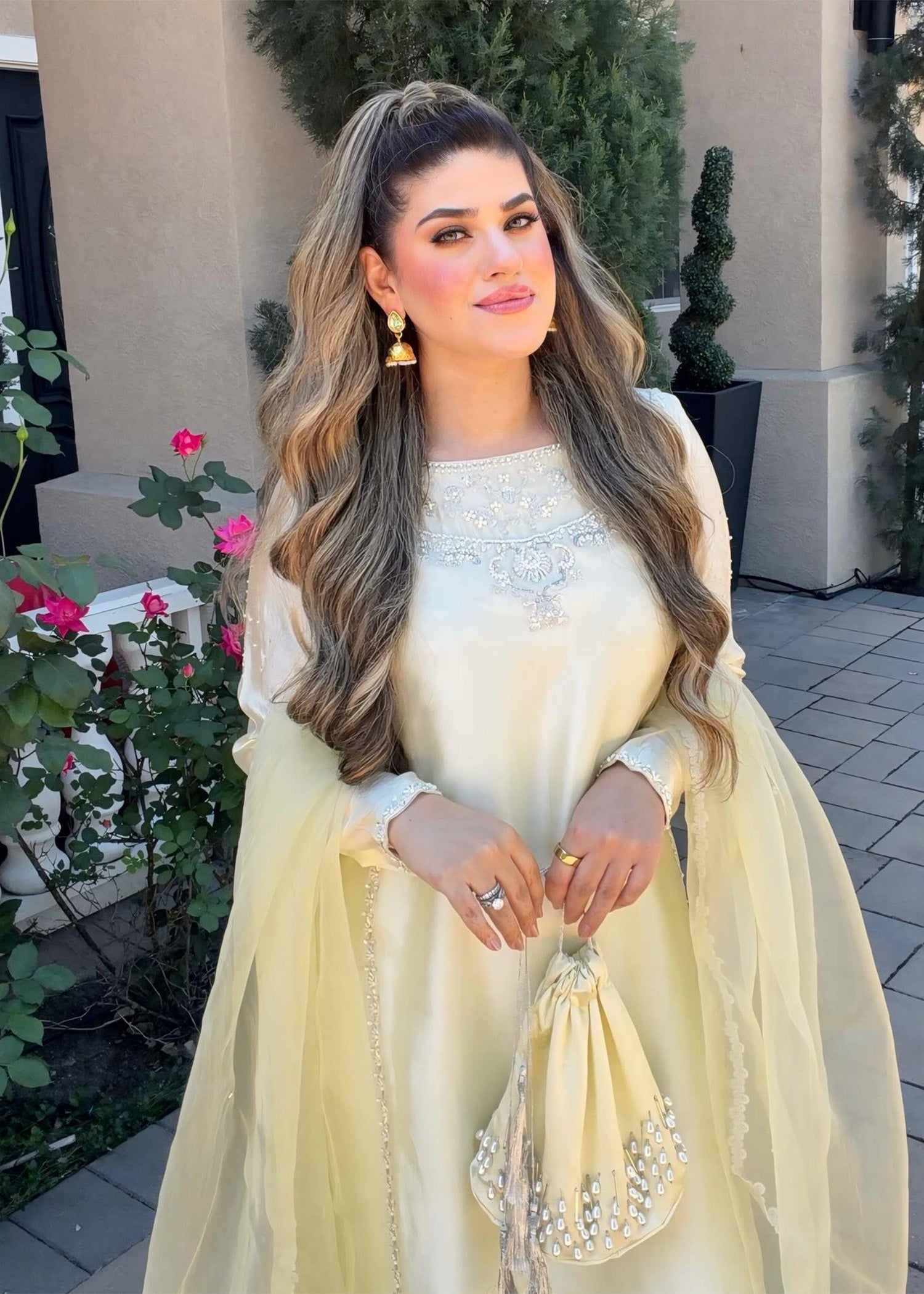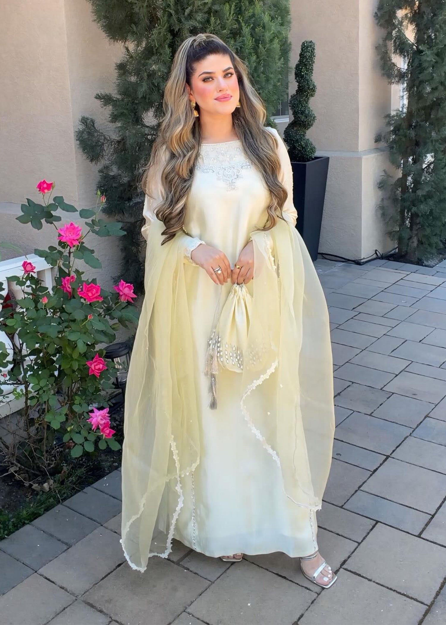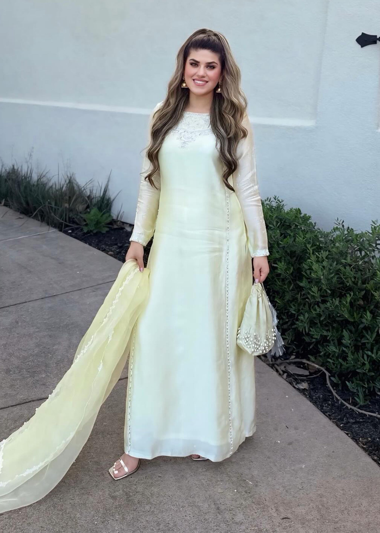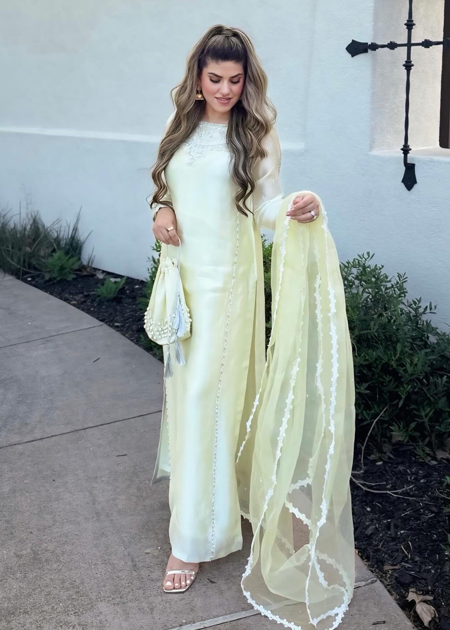 A gorgeous lemon-colored long shirt adorned with silver and ivory embellishments around the neckline and along the panels, paired with straight pants and a flowy dupatta featuring exquisite lace detailing.