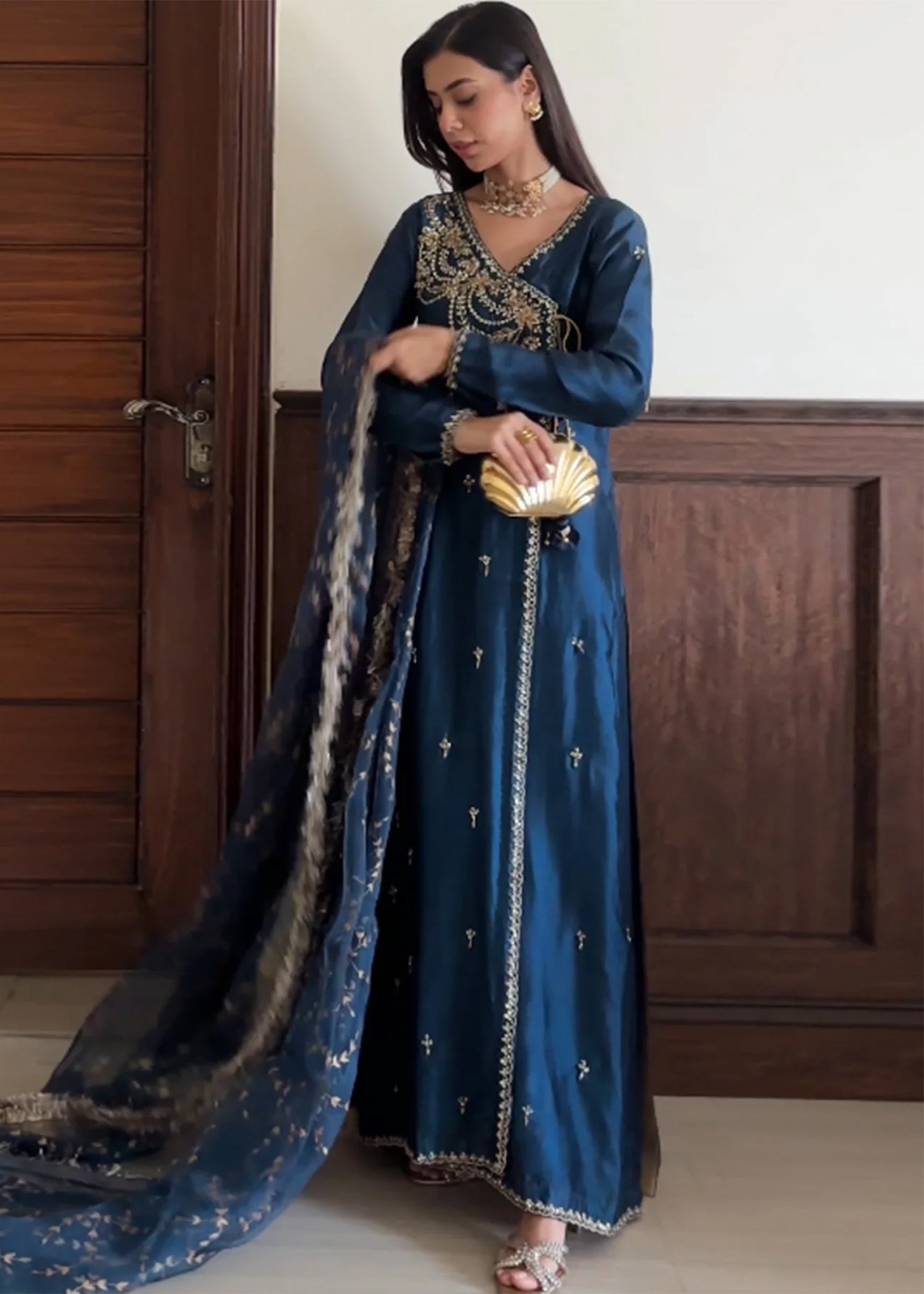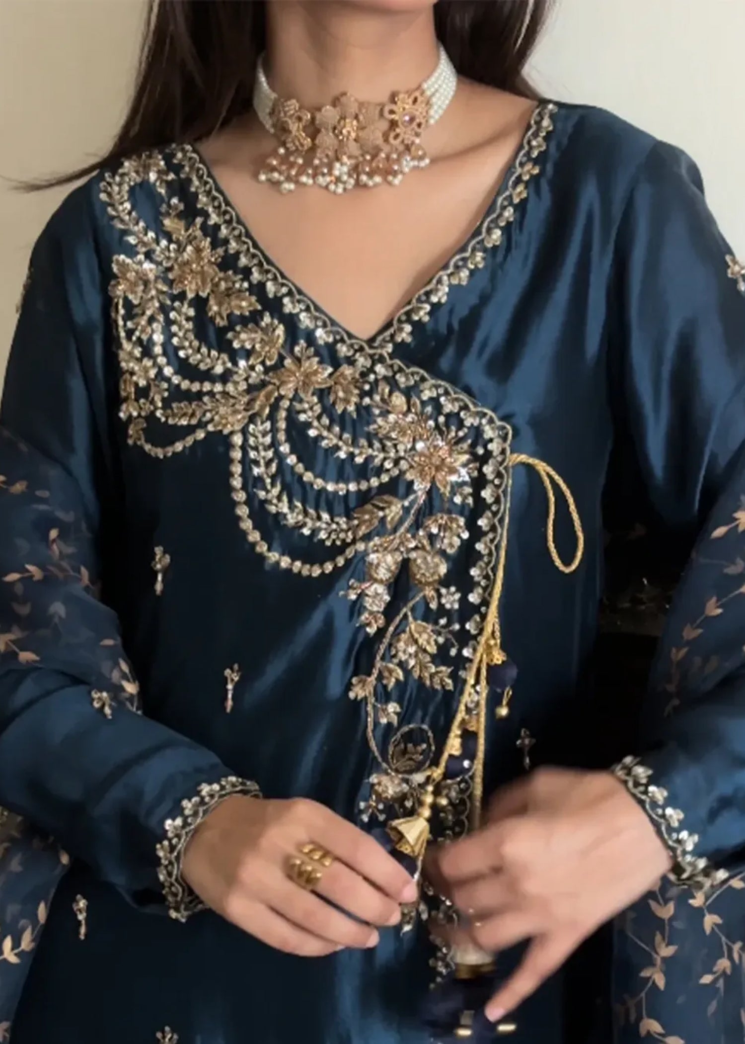 A delicately crafted and embellished angrakha on Silk Tissue with embellished neckline. It is perfectly complimented with screen printed pants and a screen printed organza dupatta. Tassels crafted by hand are added to the angrakha to complete the aesthetic. A classic outfit that will create a visually enchanting evening look!