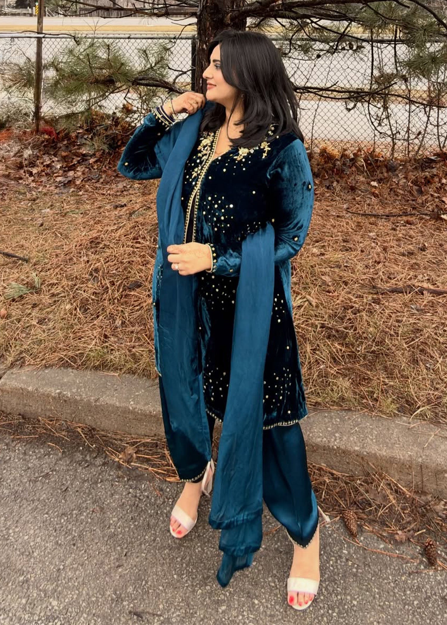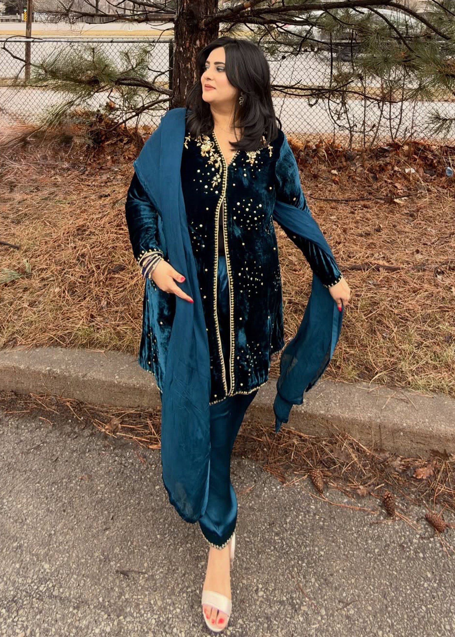 A tribute to the opulence of bygone eras, reimagined with a bold, modern twist. This radiant velvet shirt, in a rich deep teal, is exquisitely embellished with intricate hand-worked tilla, sequins, and silk thread detailing. The contemporary, front-open design and thigh-skimming cut lend a fresh, flattering silhouette, while the pure silk shalwar, adorned with stunning gold embroidery, completes the look with timeless elegance.