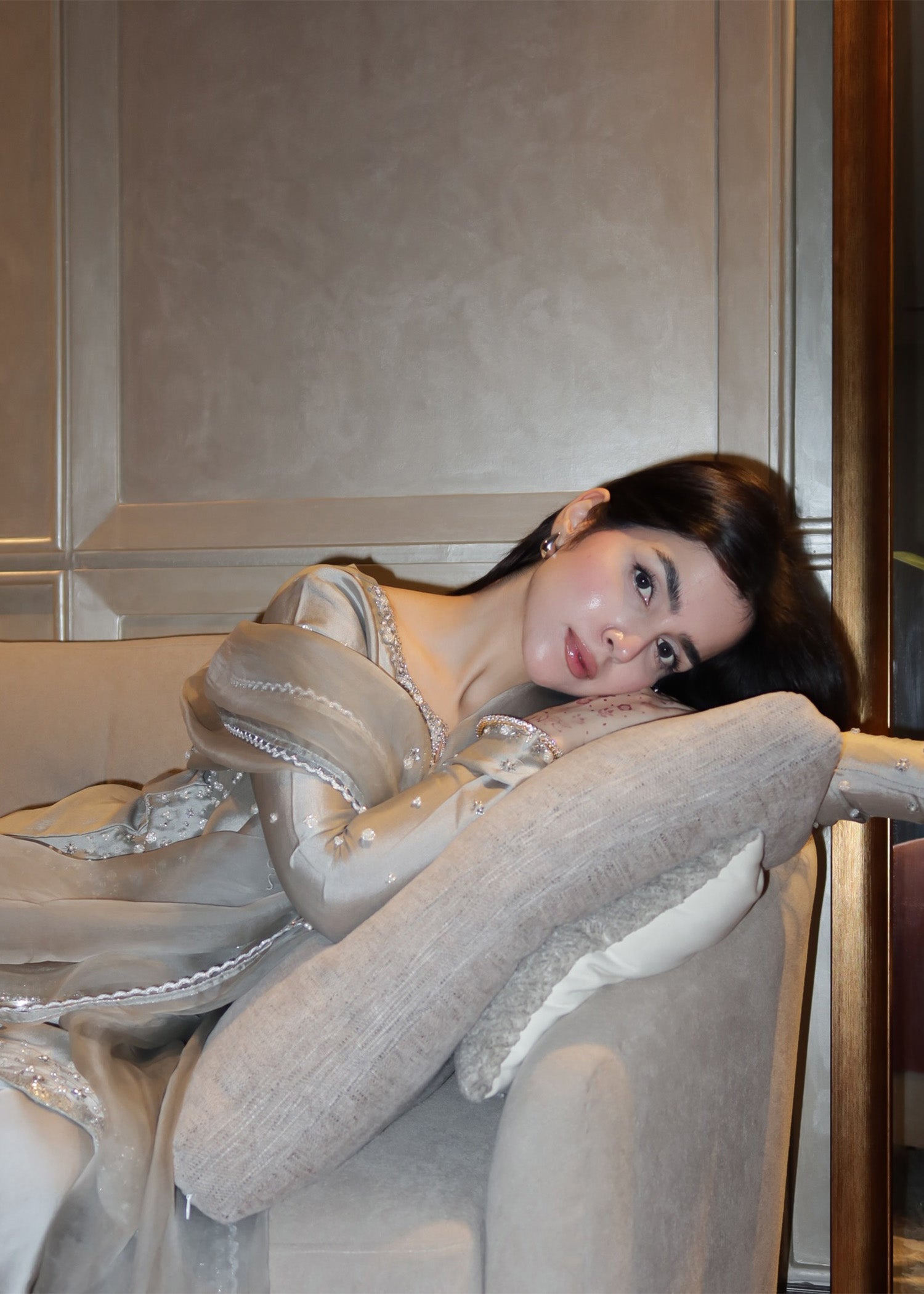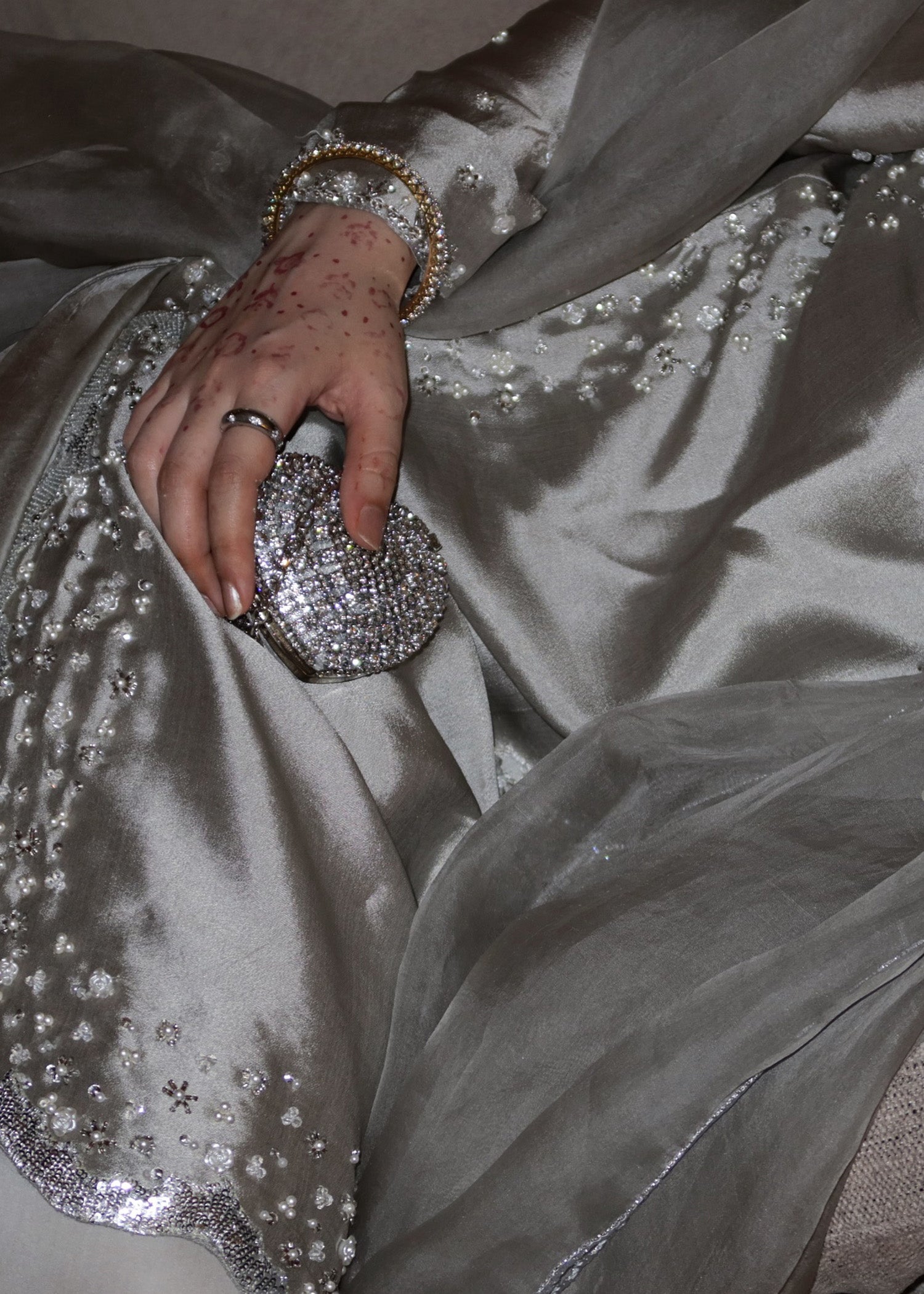 A cool-toned grey silhouette with intricate handwork that catches light with every movement. The contrast between delicate embellishment and strong structure creates a design that feels modern, fearless, and refined.