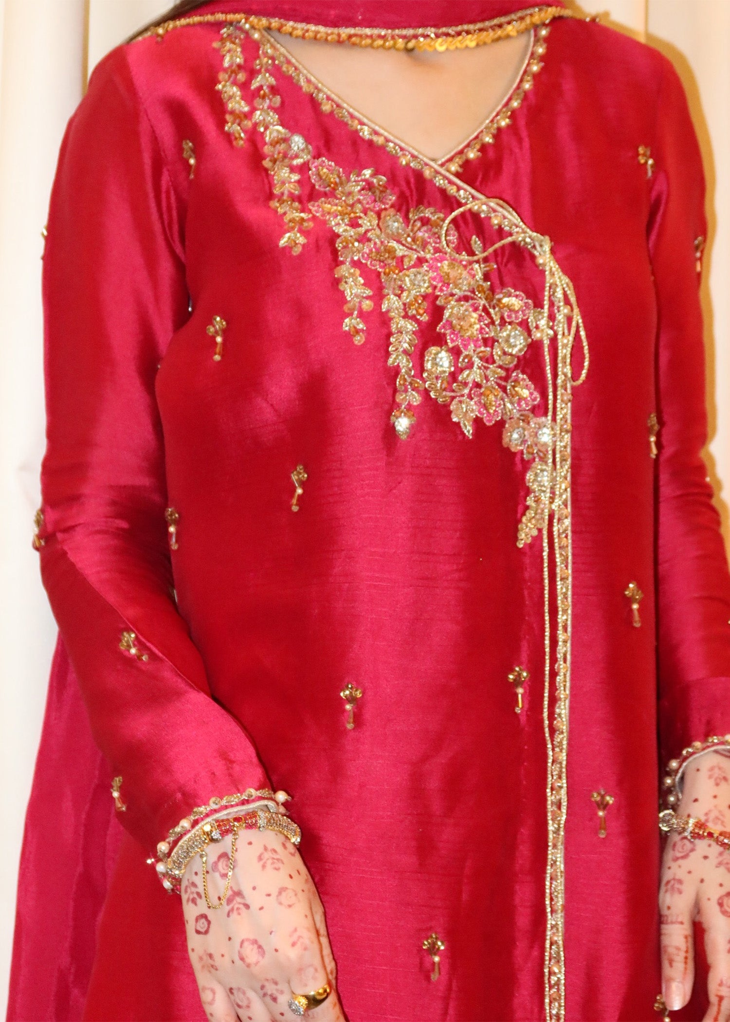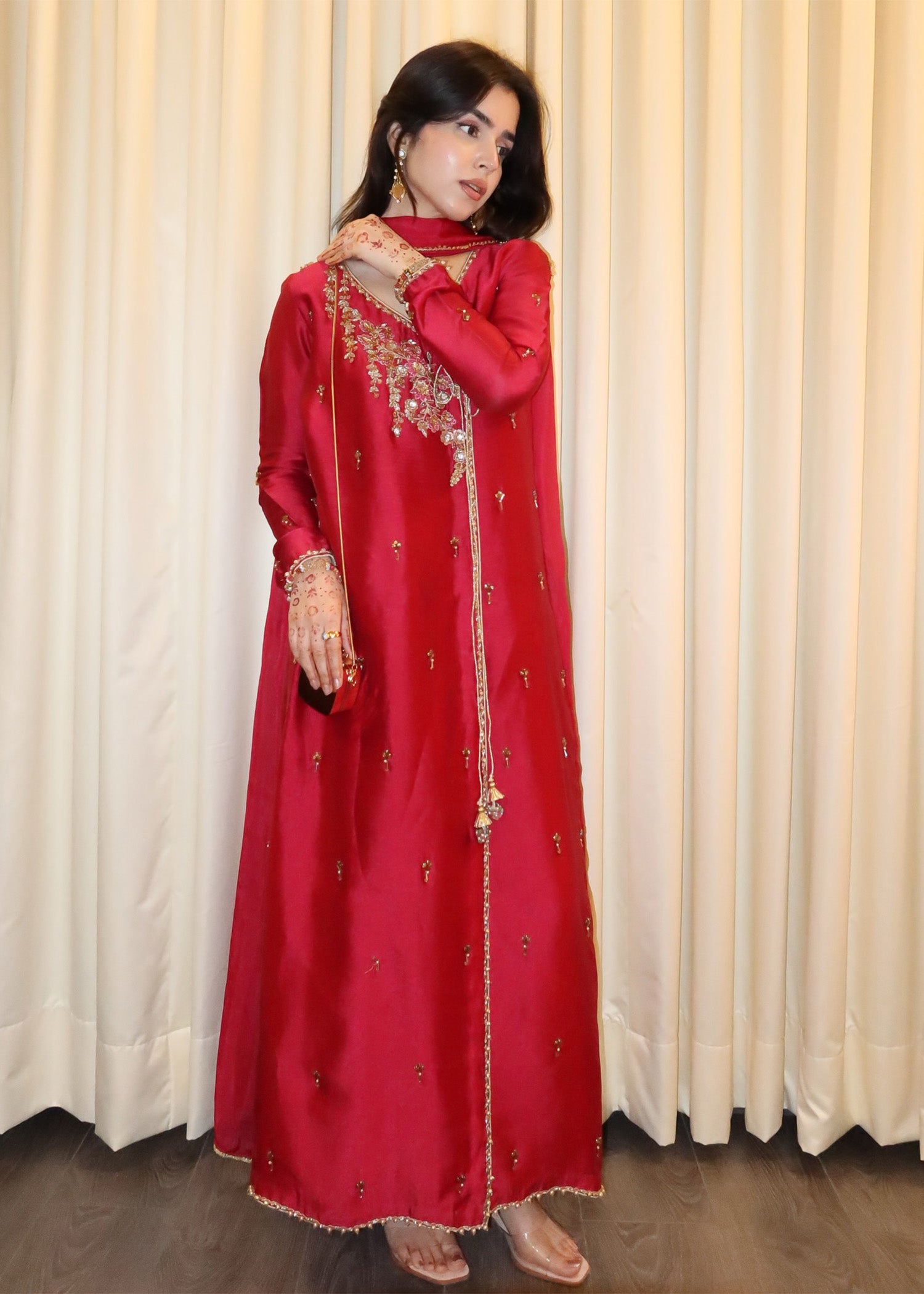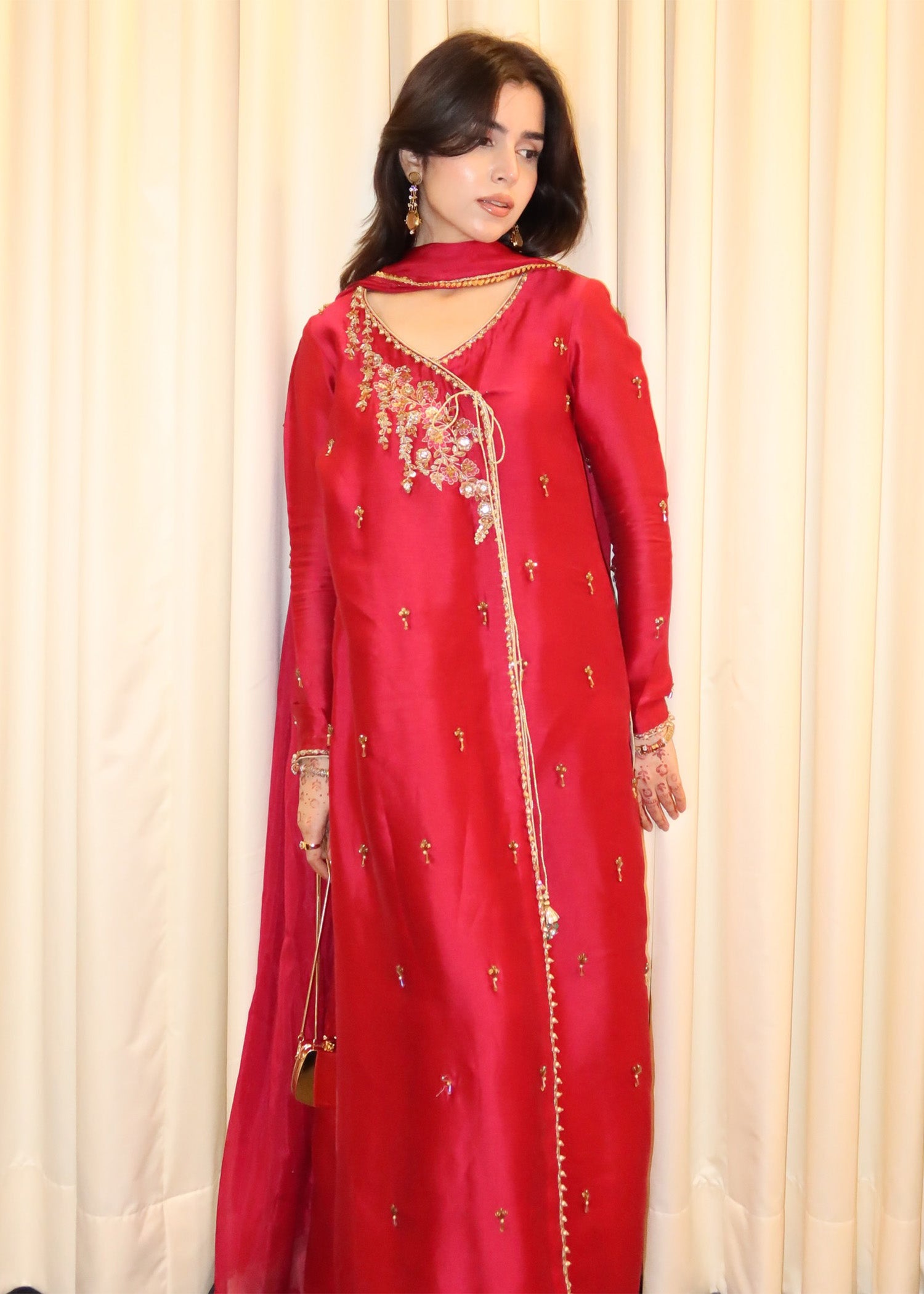 "Spice" is a timeless anghrakha featuring exquisite handwork at the front, complemented by beautiful tassels. It’s paired with straight pants and a delicate organza dupatta adorned with booti work, creating a perfect blend of tradition and style.