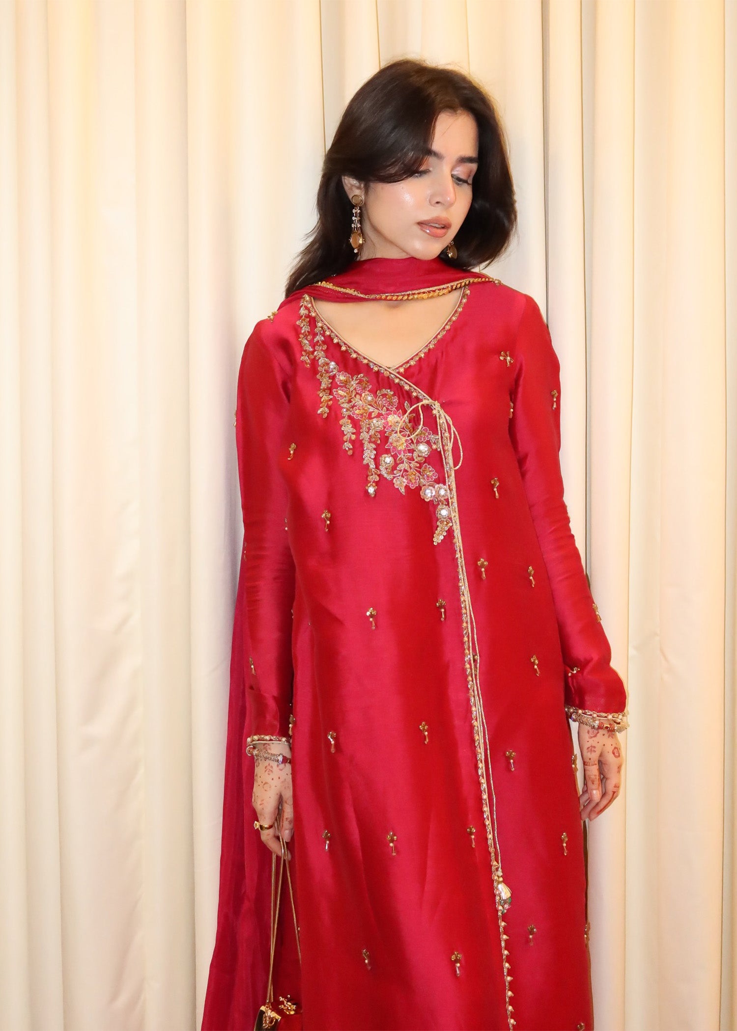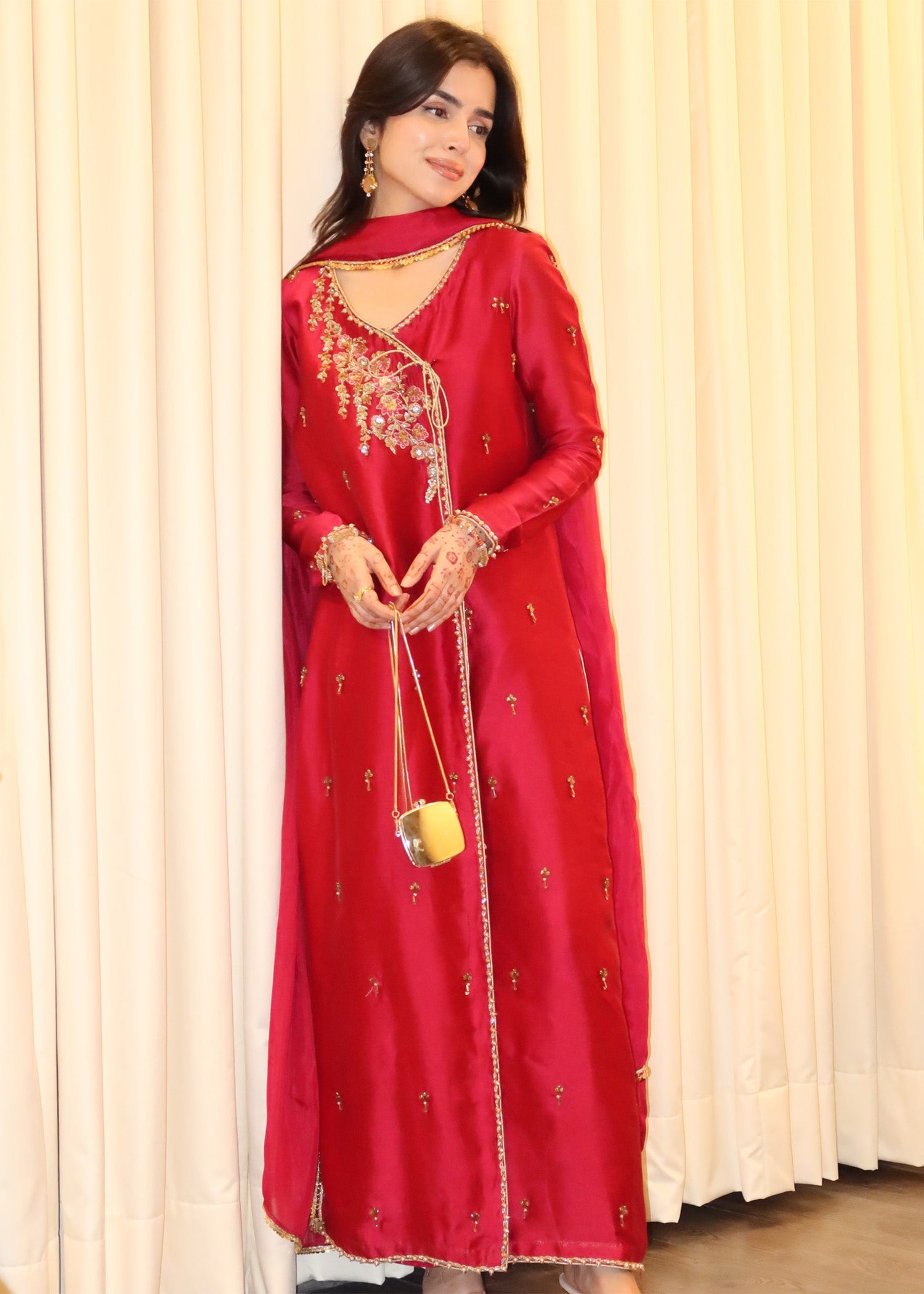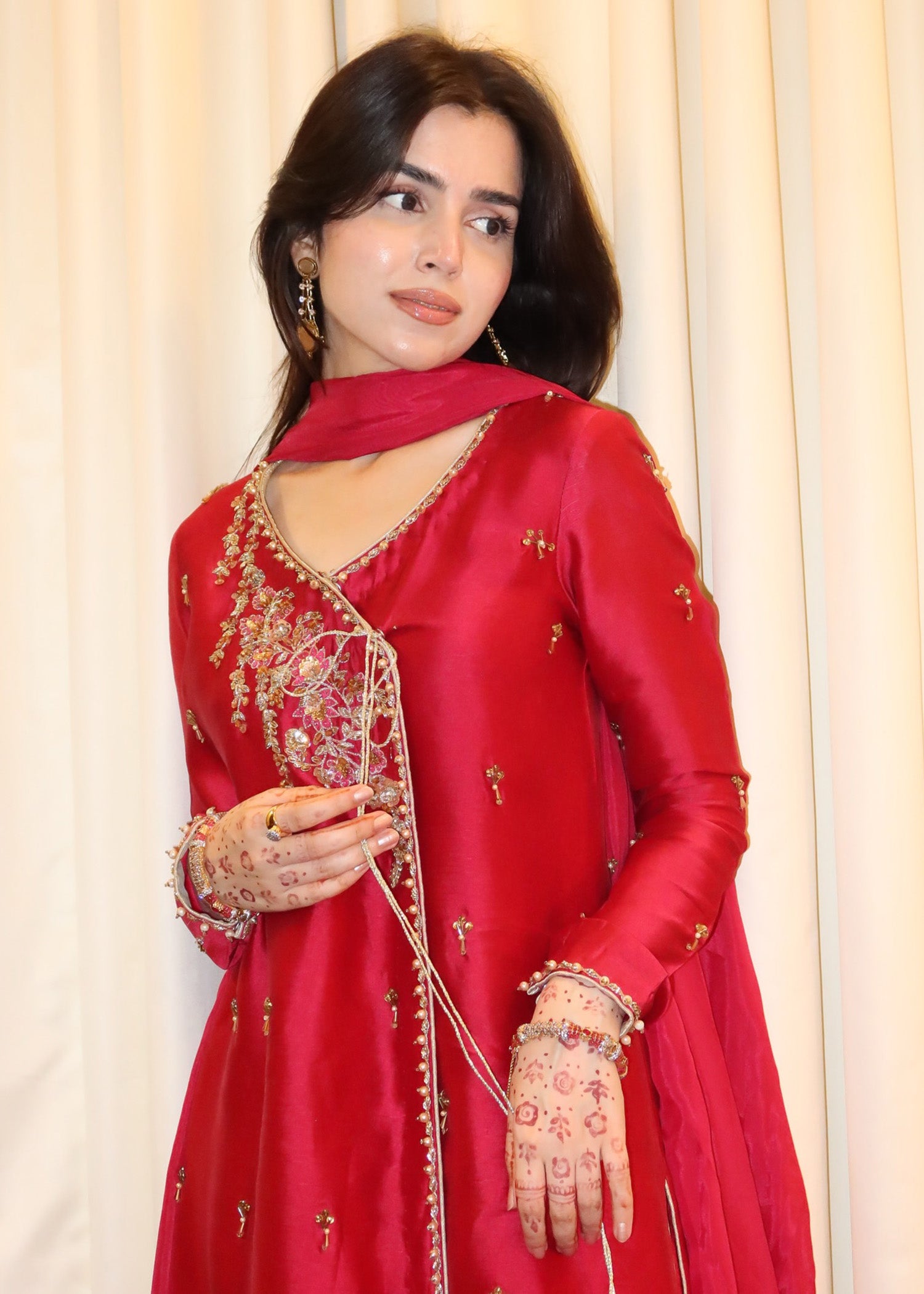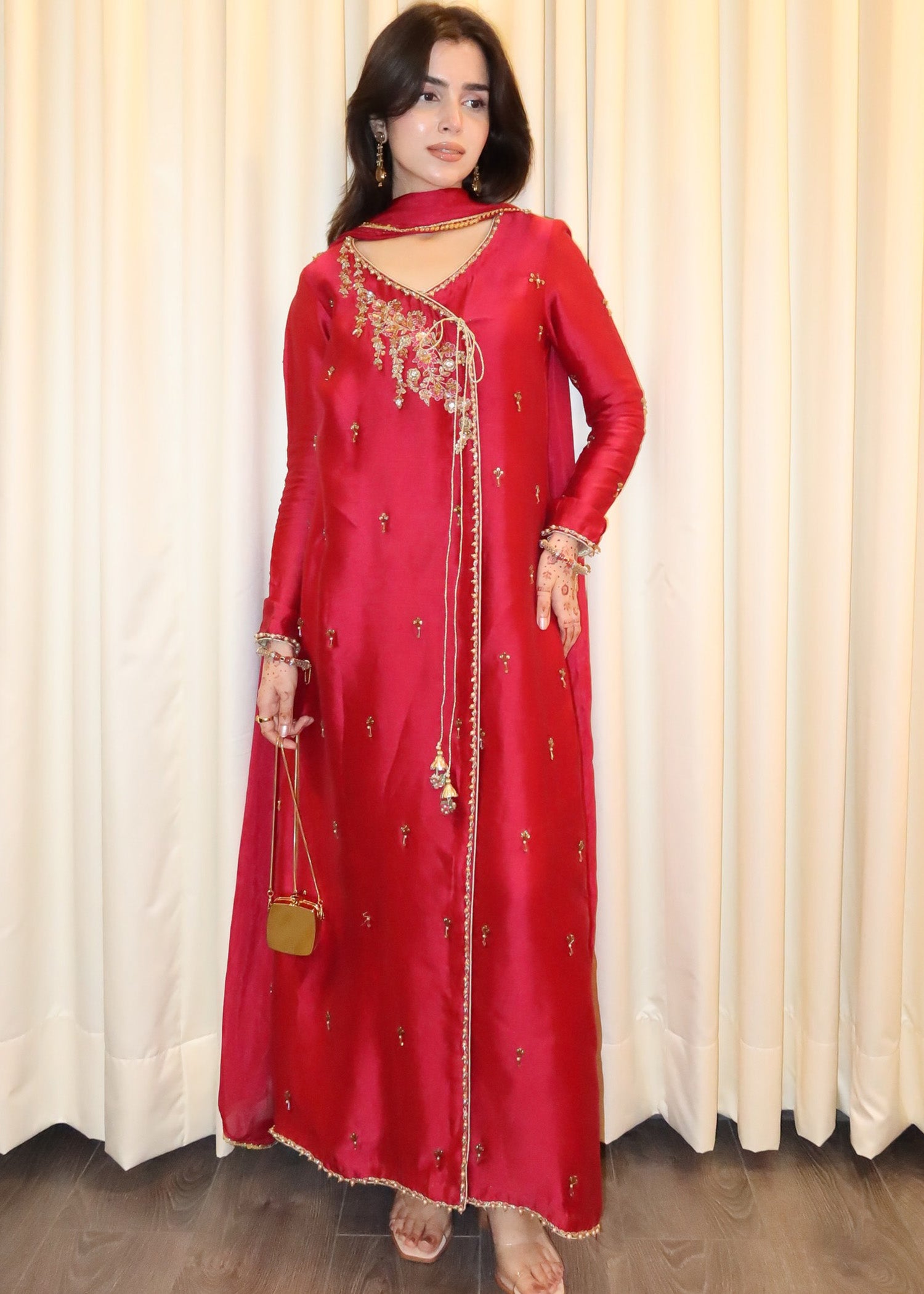 "Spice" is a timeless anghrakha featuring exquisite handwork at the front, complemented by beautiful tassels. It’s paired with straight pants and a delicate organza dupatta adorned with booti work, creating a perfect blend of tradition and style.