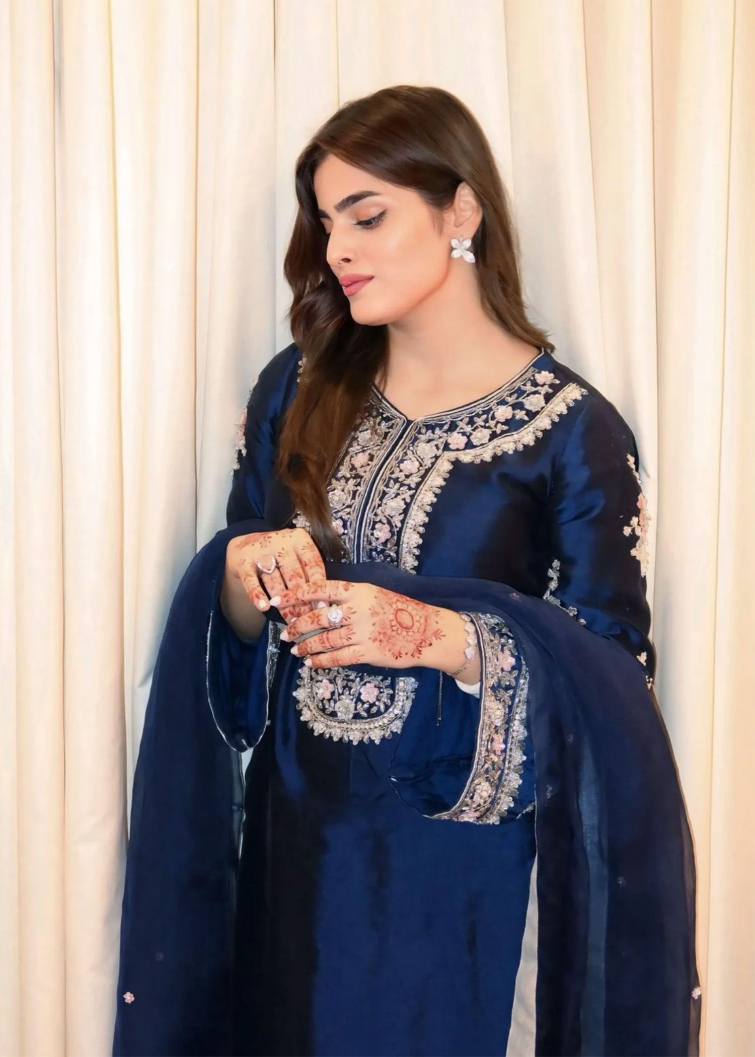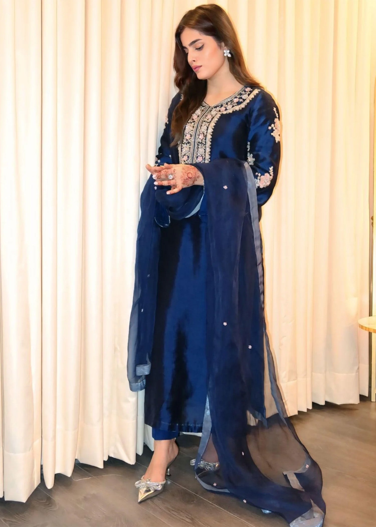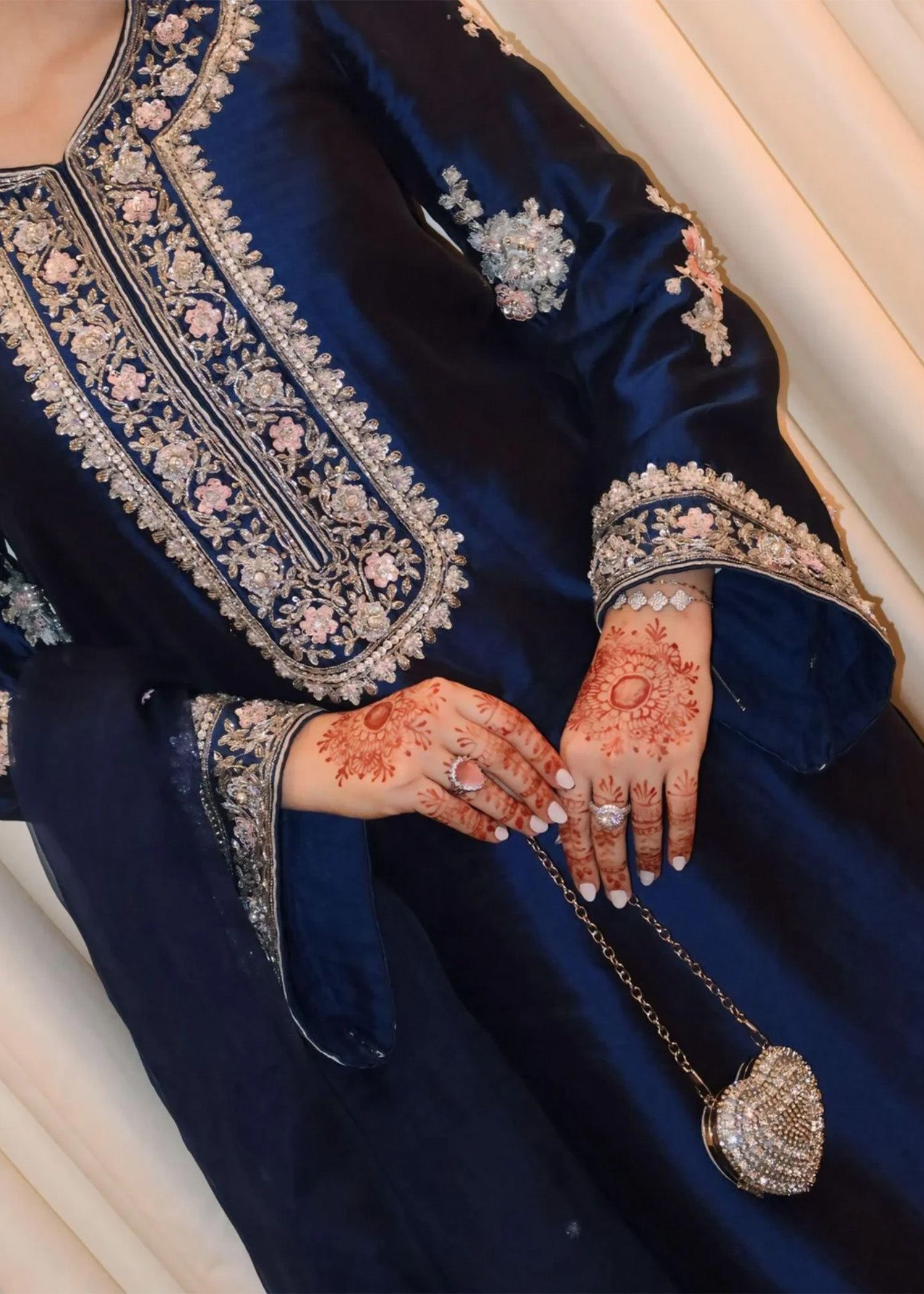 This elegant ensemble features a shirt crafted from pure tissue silk, adorned with intricate embroidery around the neckline and beautifully detailed floral bunches on the sleeves, adding a graceful touch. The trousers are made from luxurious Korean raw silk, offering a rich texture and refined silhouette. The outfit is complemented by a delicate organza dupatta, which adds an airy and sophisticated finish to the look.