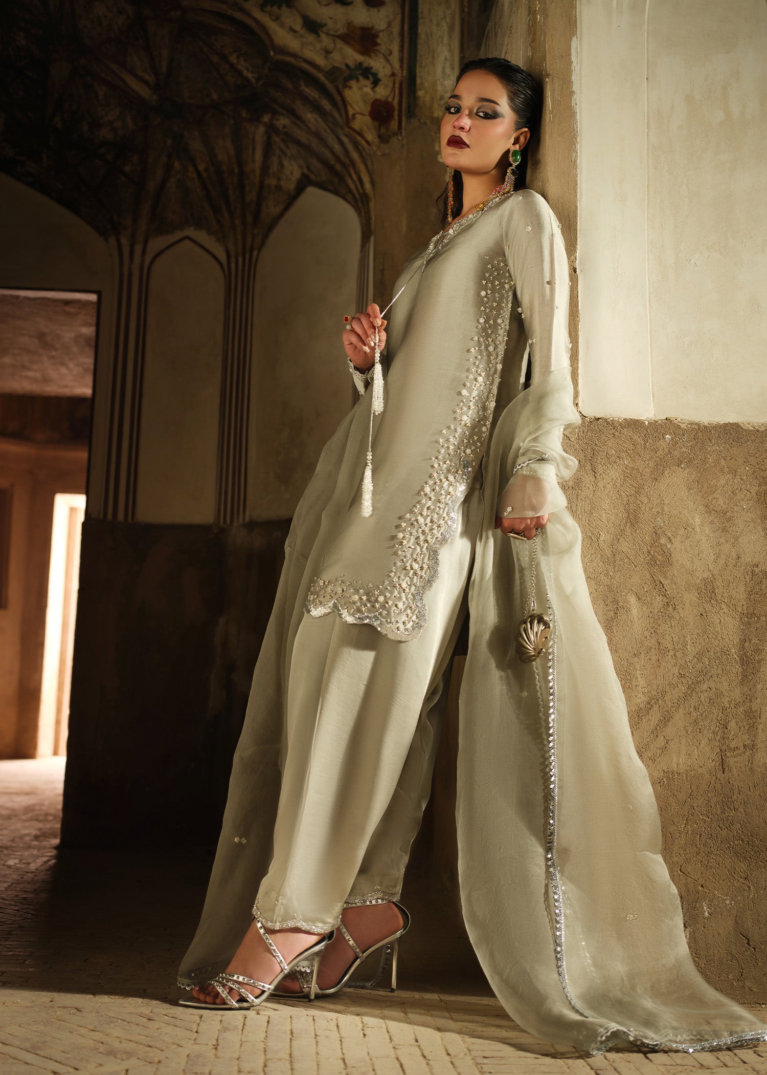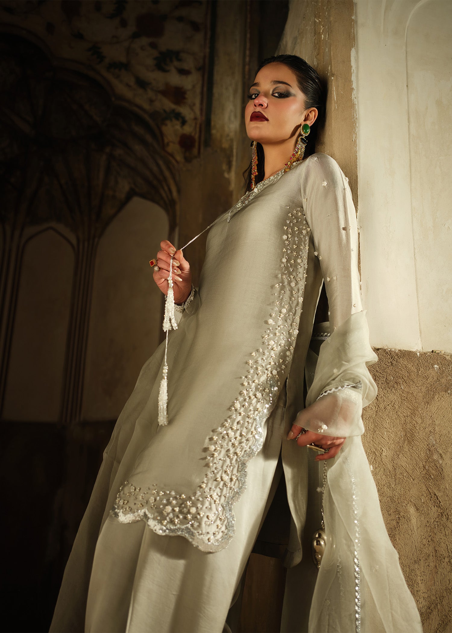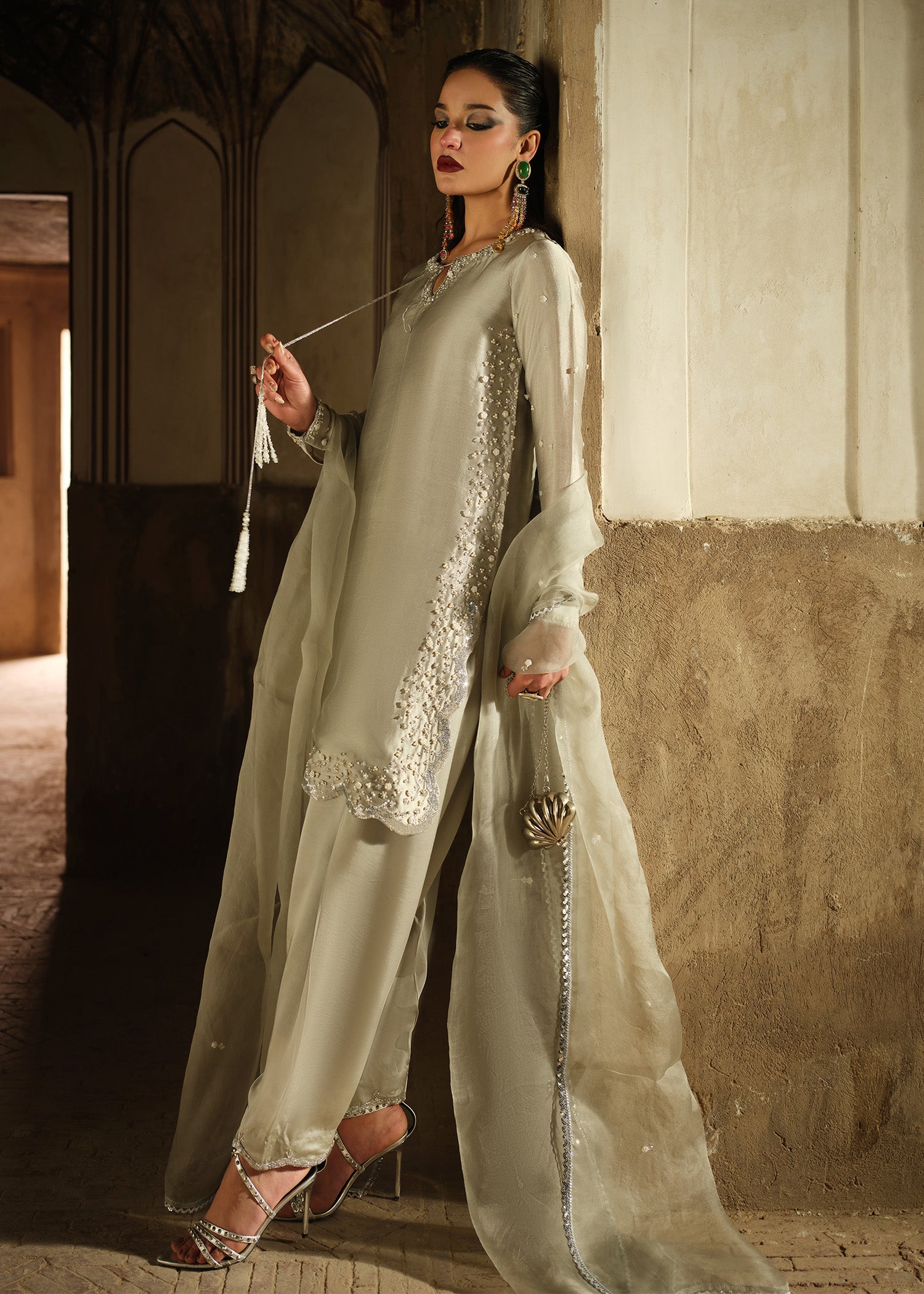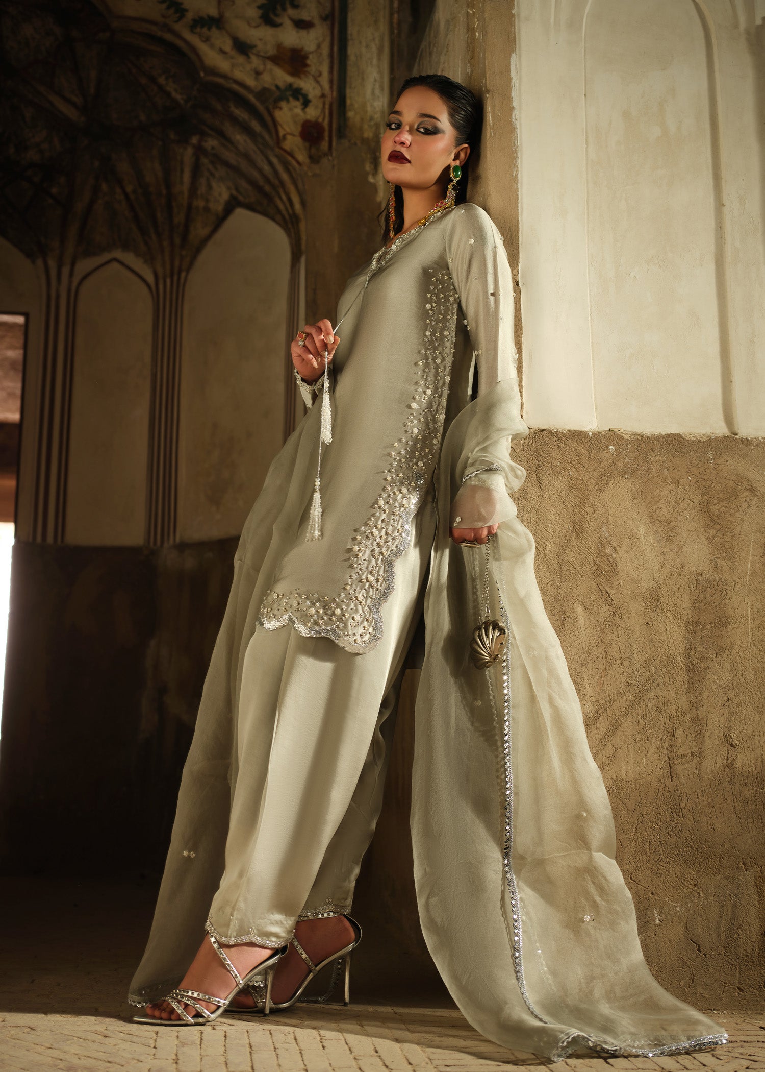 A cool-toned grey silhouette with intricate handwork that catches light with every movement. The contrast between delicate embellishment and strong structure creates a design that feels modern, fearless, and refined.