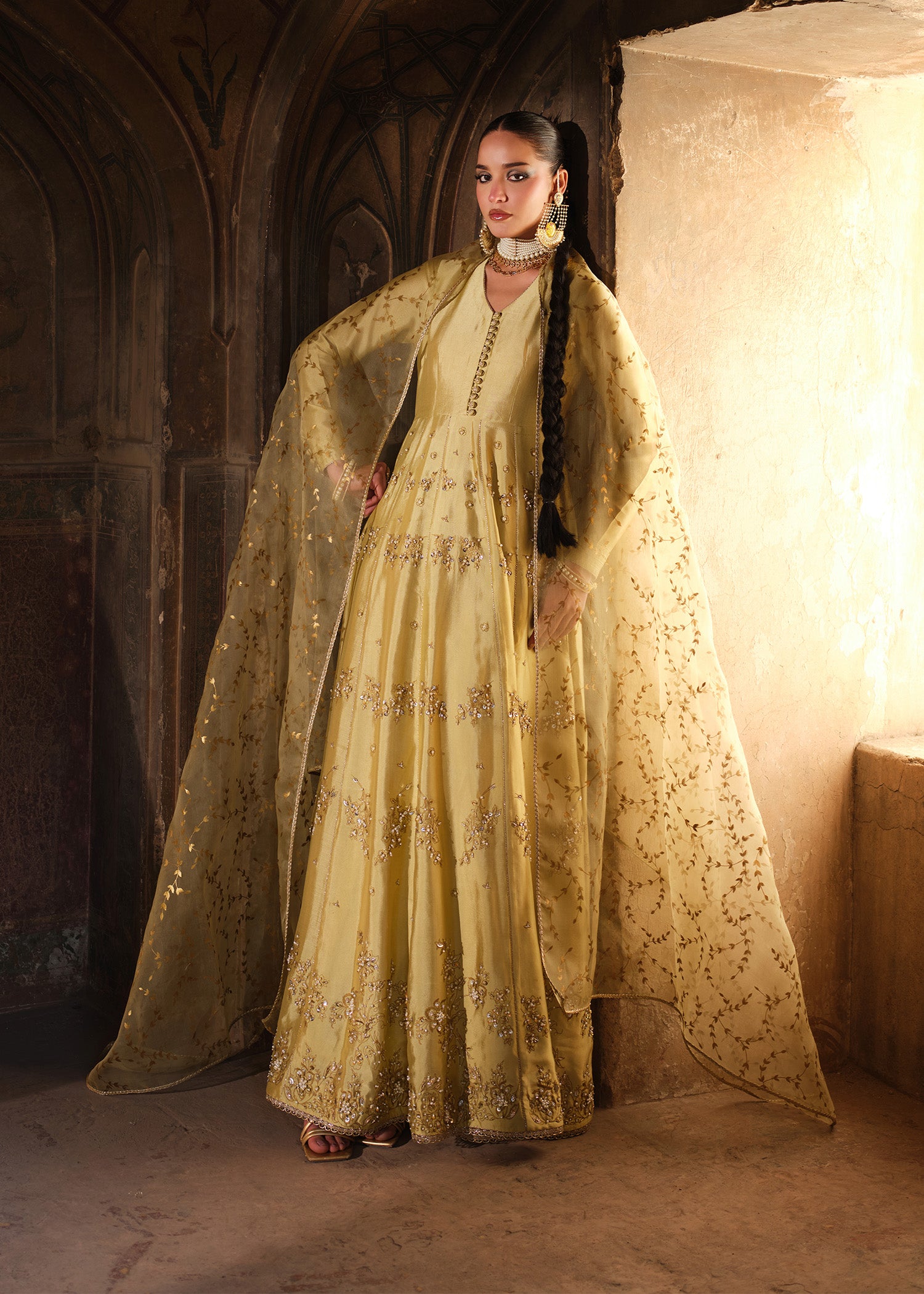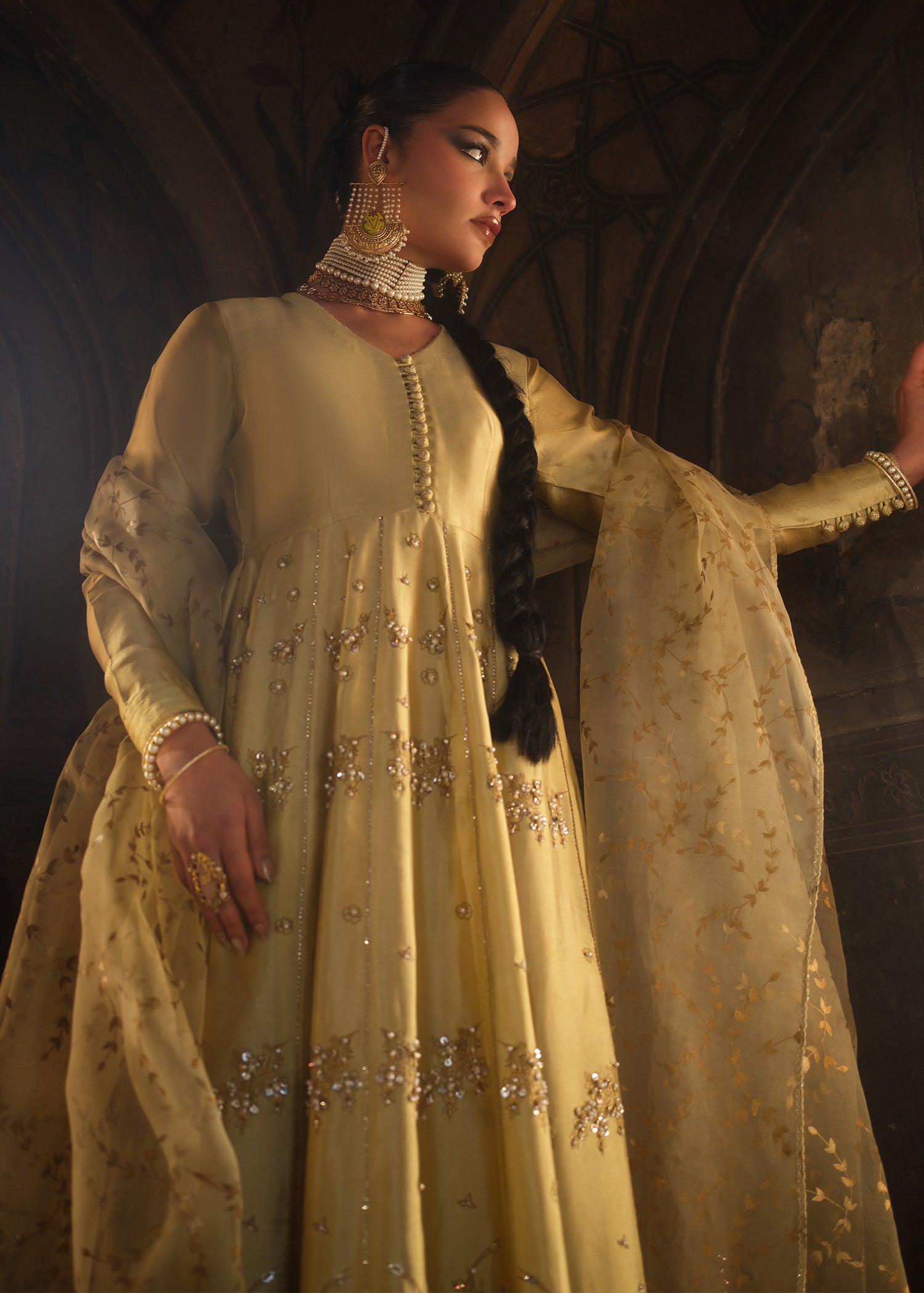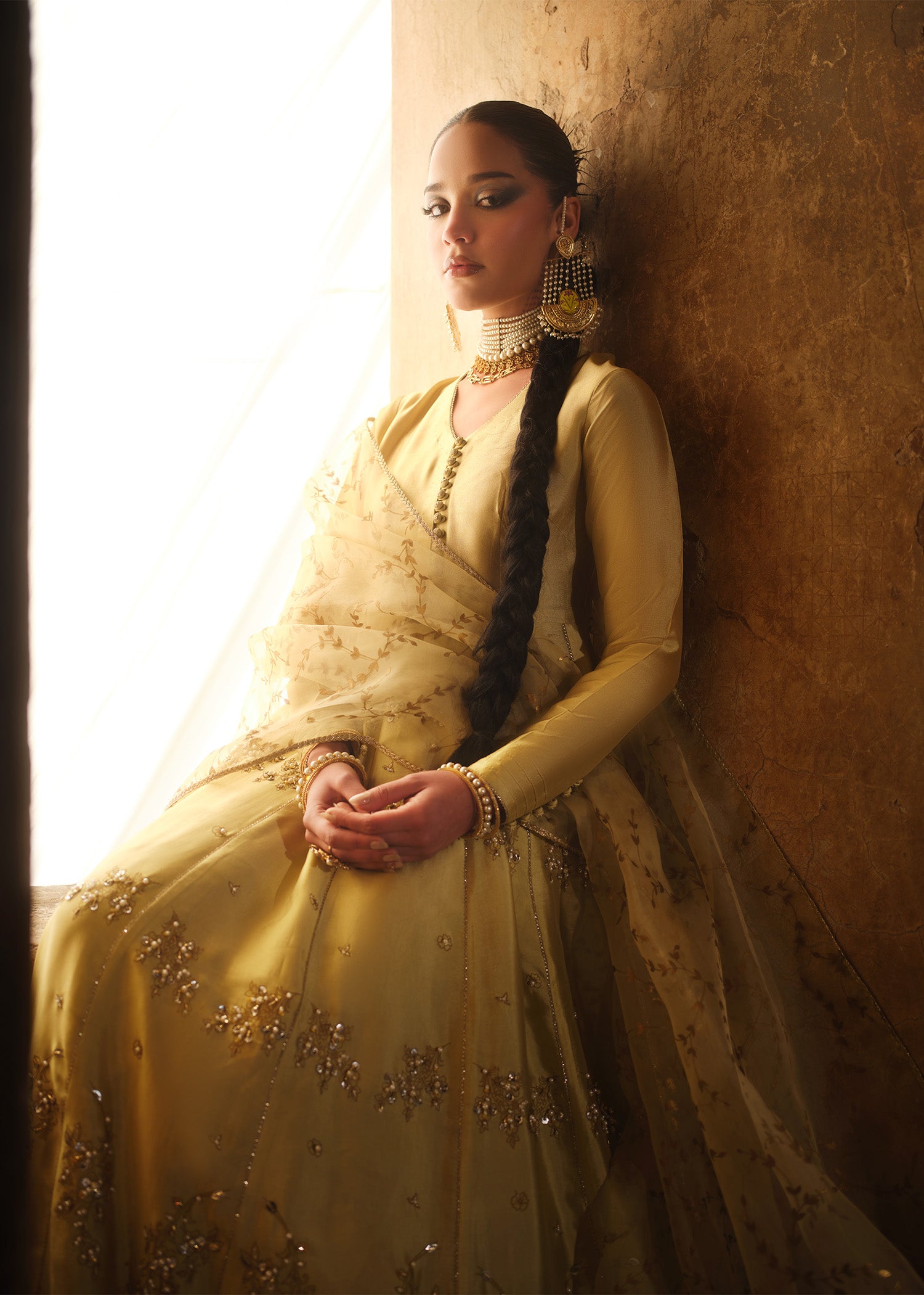 An opulent mustard silhouette adorned with intricate embellishment, softened by sheer layers and graceful movement. Traditional craft meets modern form in a design that feels regal yet restrained.