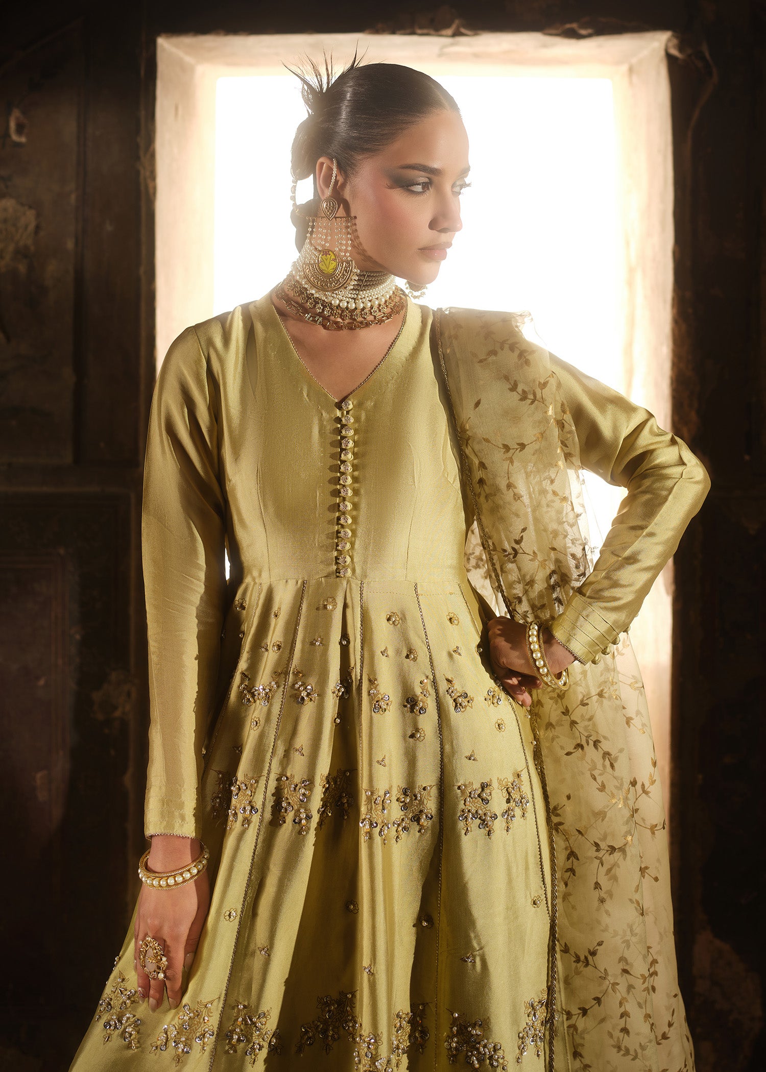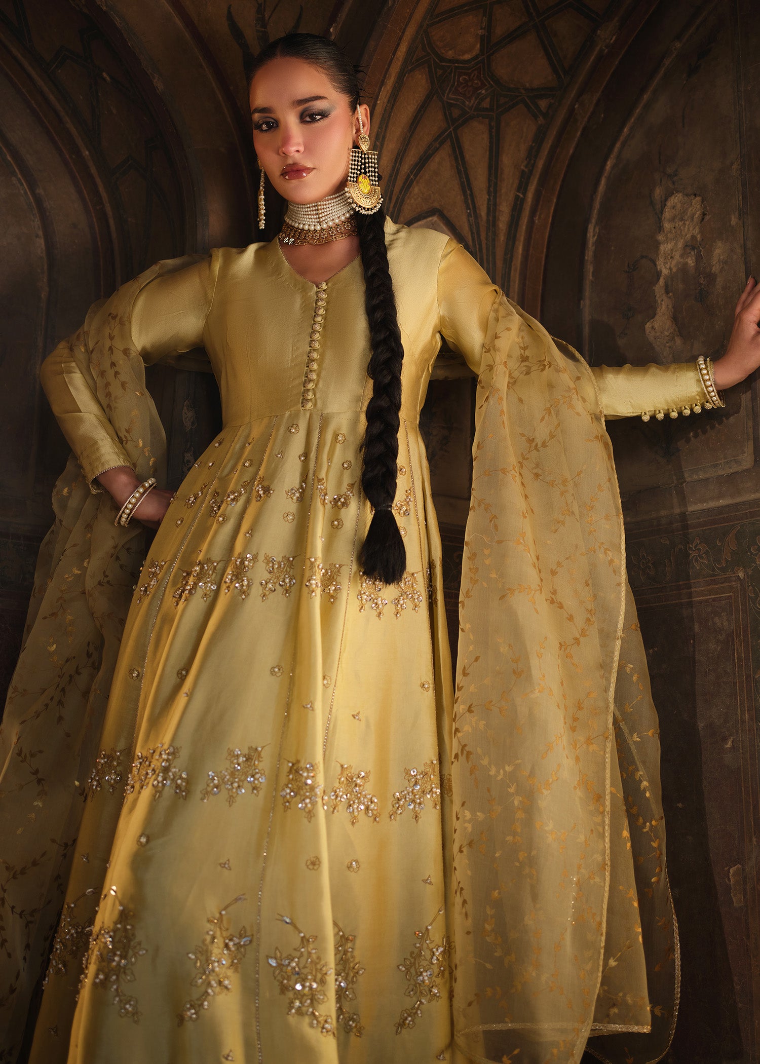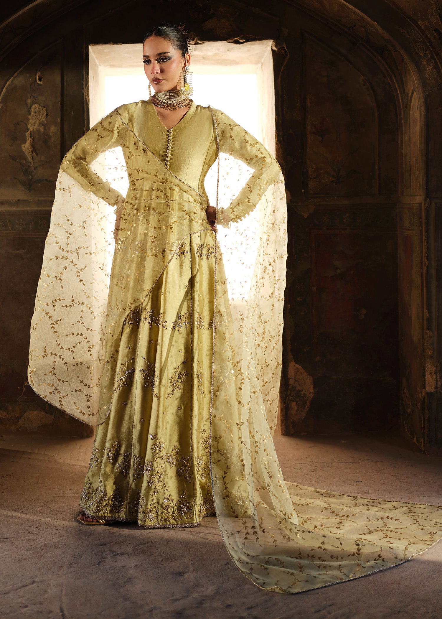 An opulent mustard silhouette adorned with intricate embellishment, softened by sheer layers and graceful movement. Traditional craft meets modern form in a design that feels regal yet restrained.