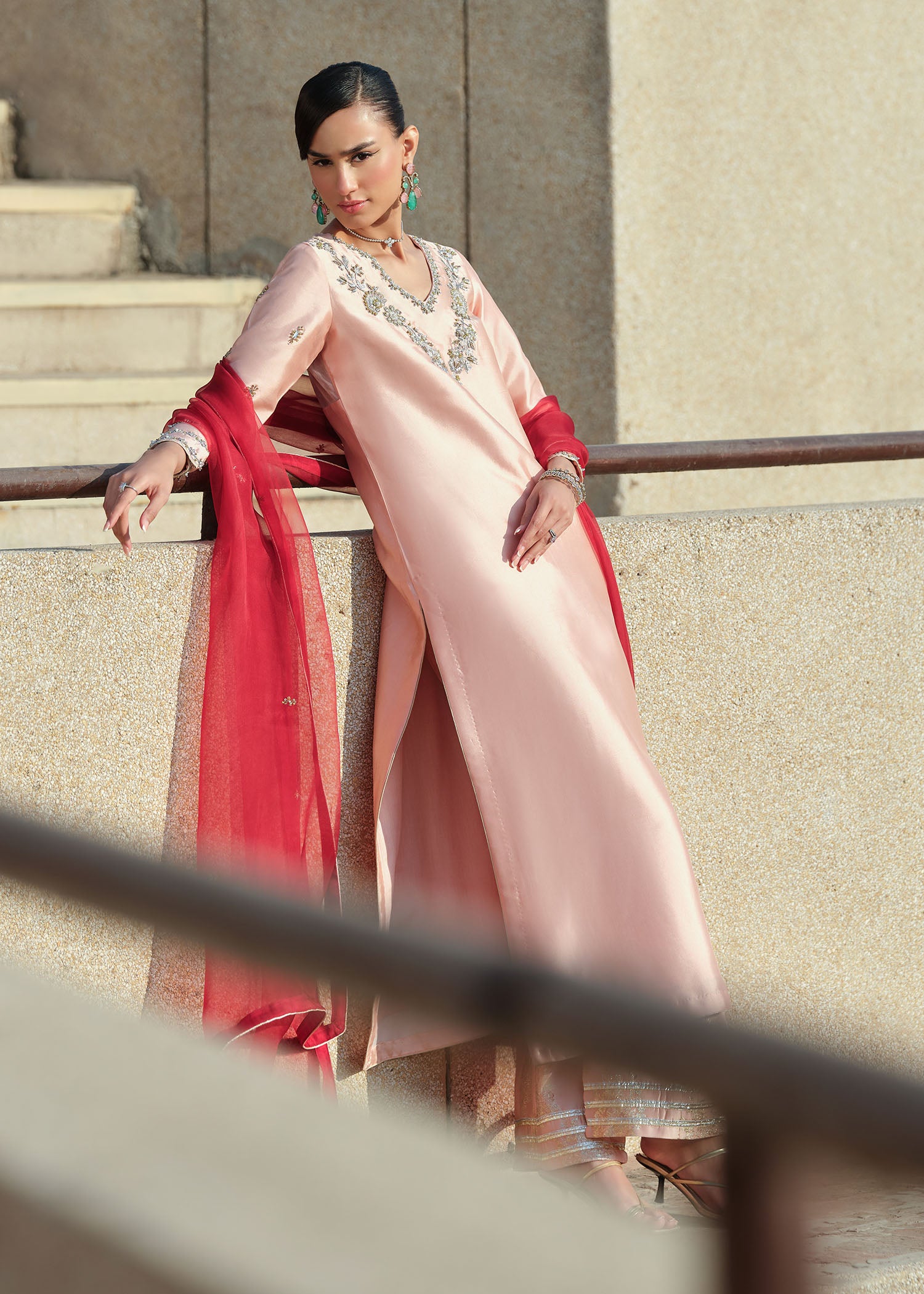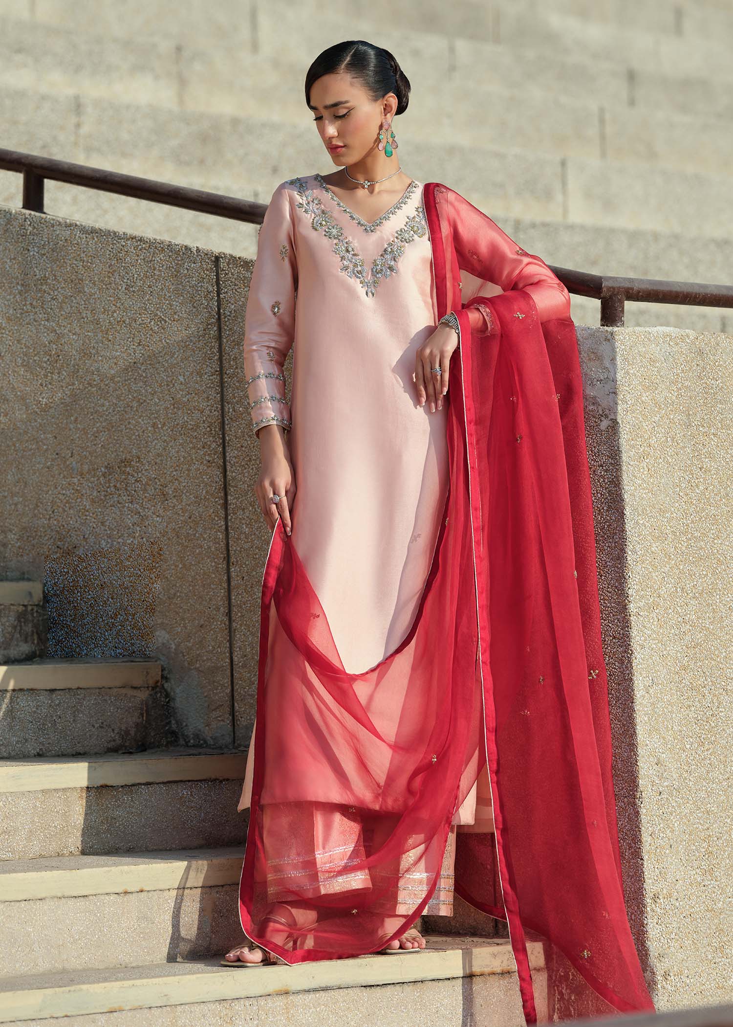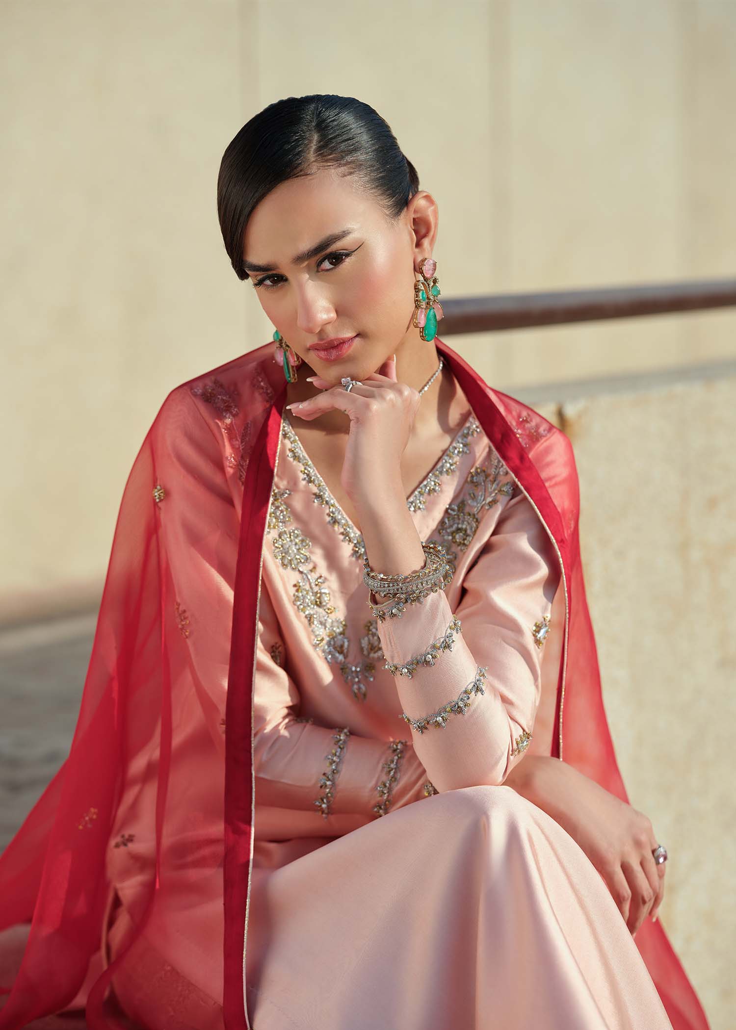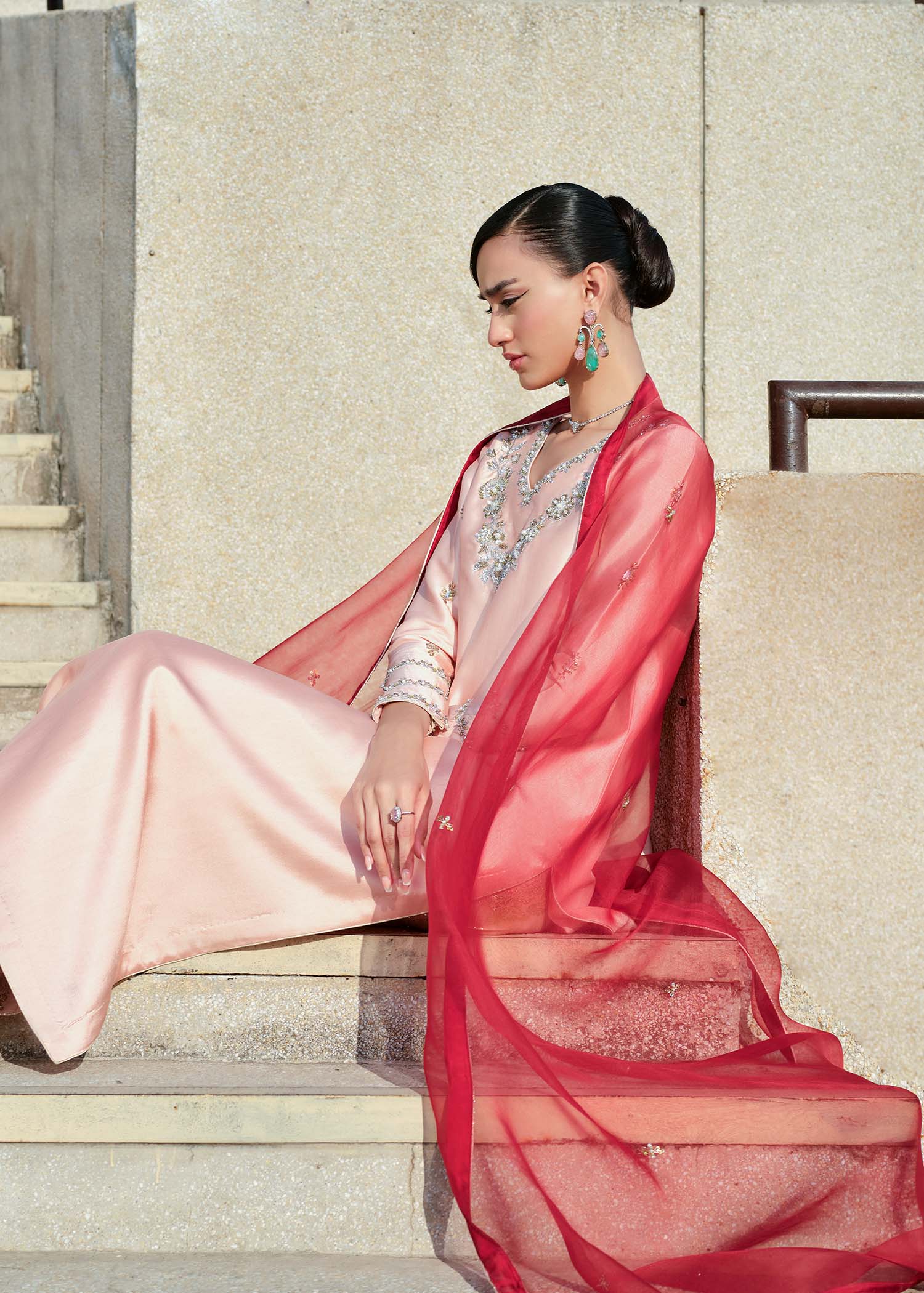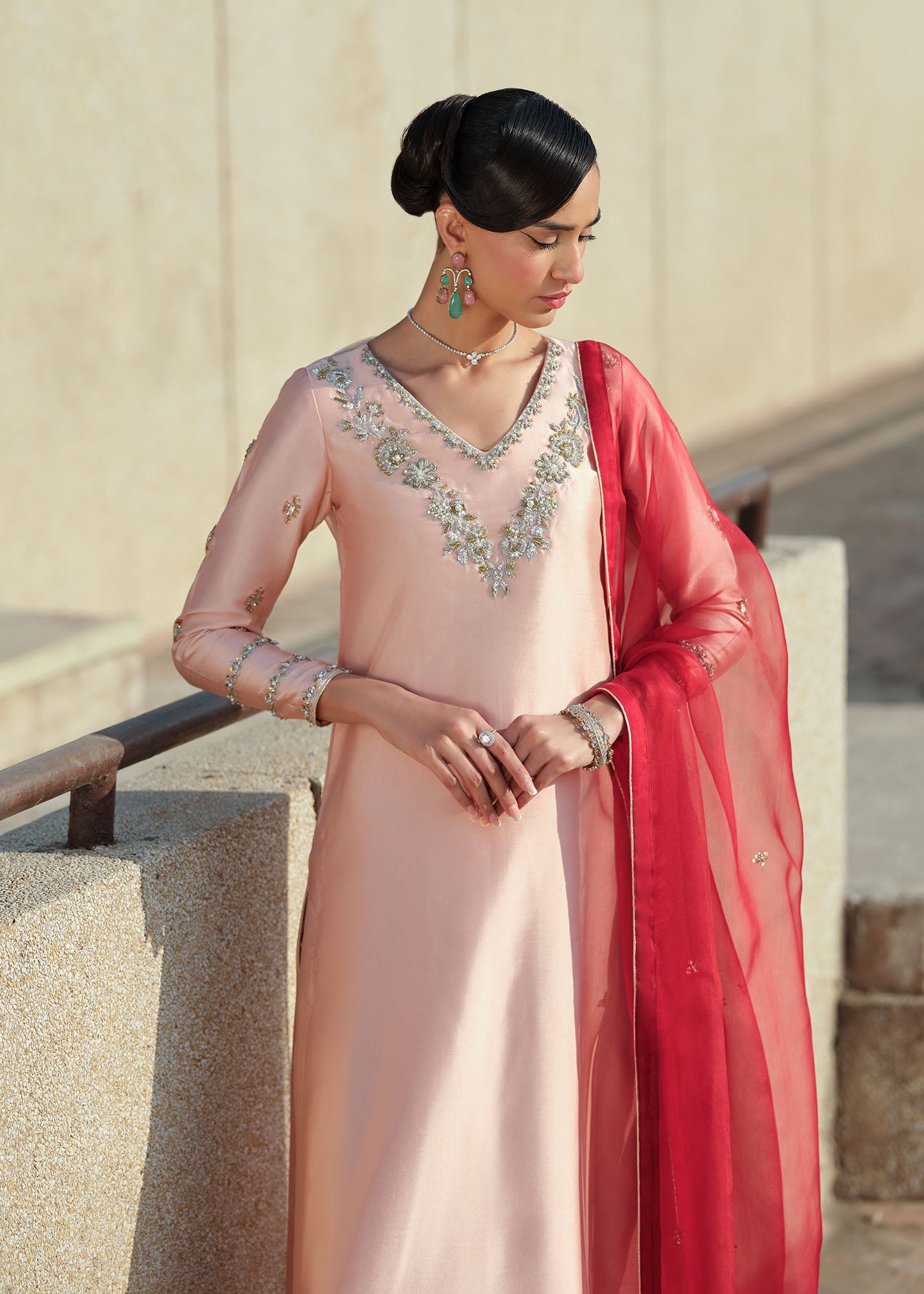 A soft blush outfit elevated with intricate neckline detailing and a contrasting organza dupatta. Designed for festive evenings with a confident, contemporary edge. Each outfit is thoughtfully finished with a modest back neckline.
