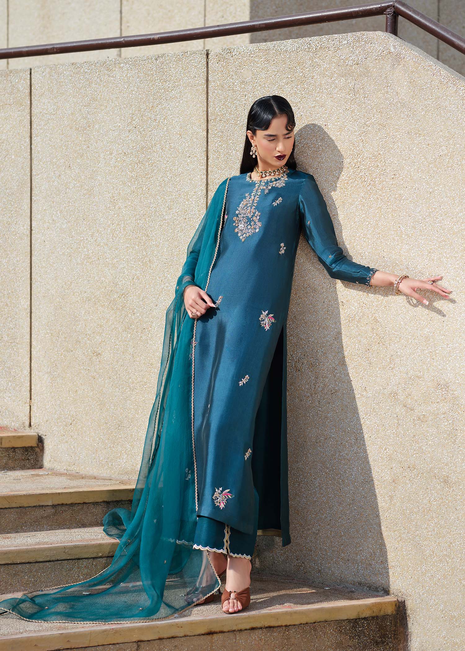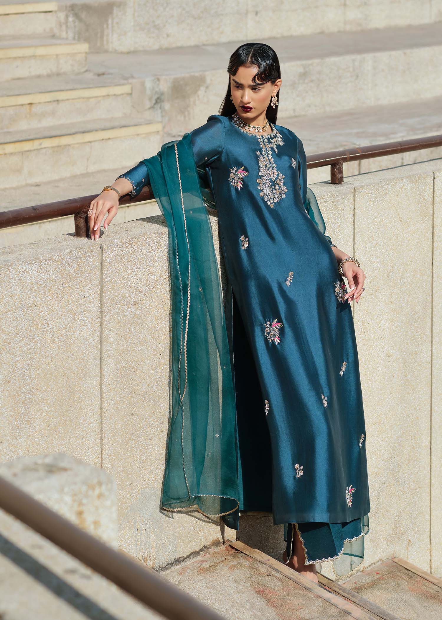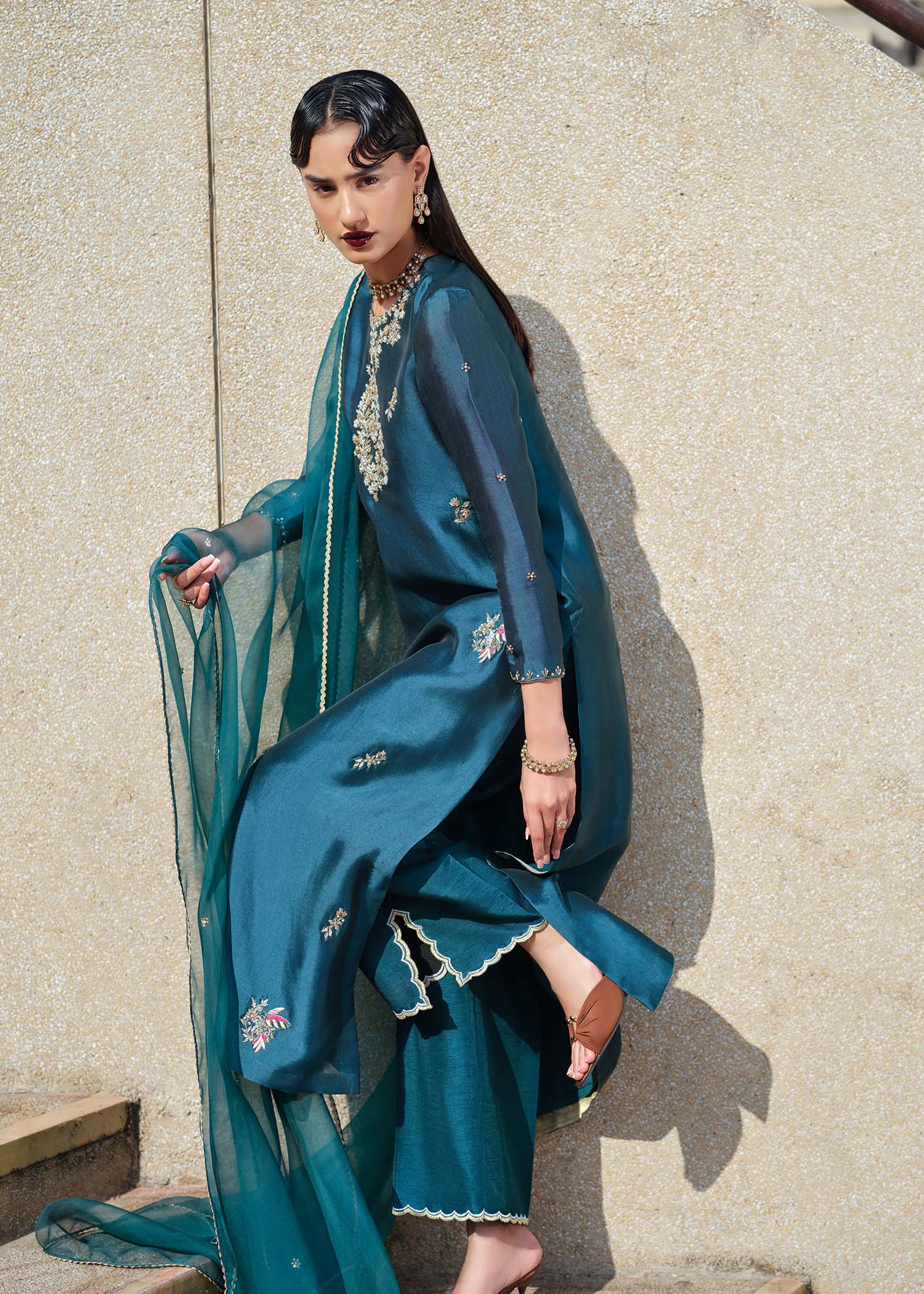 A deep emerald ensemble crafted for understated power. The embroidered shirt is paired with tailored culotte pants and finished with a sheer organza dupatta for a refined, elevated look.