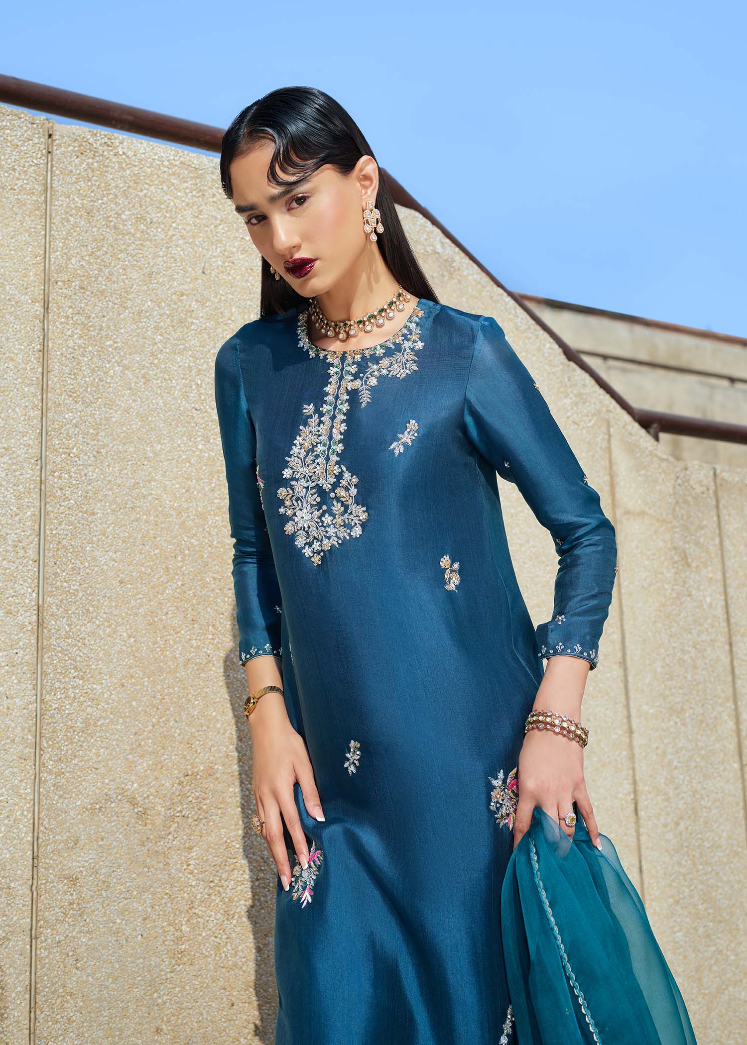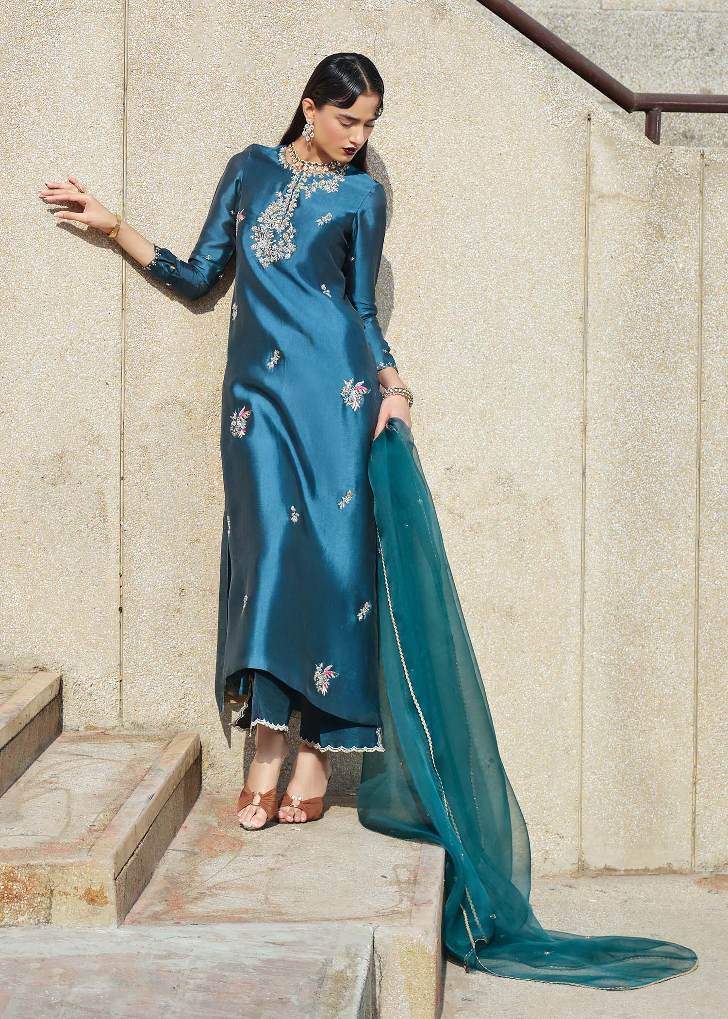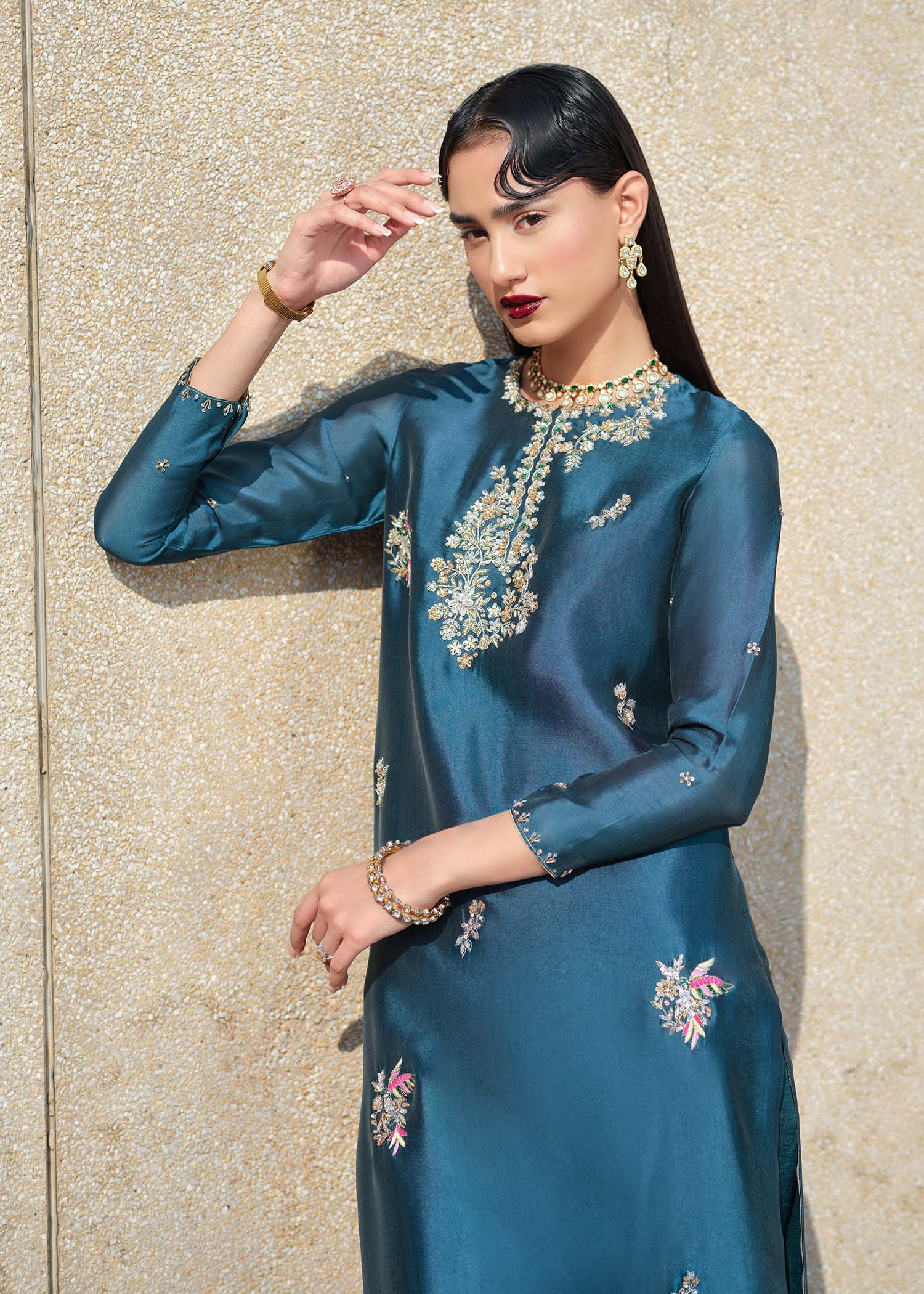 A deep emerald ensemble crafted for understated power. The embroidered shirt is paired with tailored culotte pants and finished with a sheer organza dupatta for a refined, elevated look.