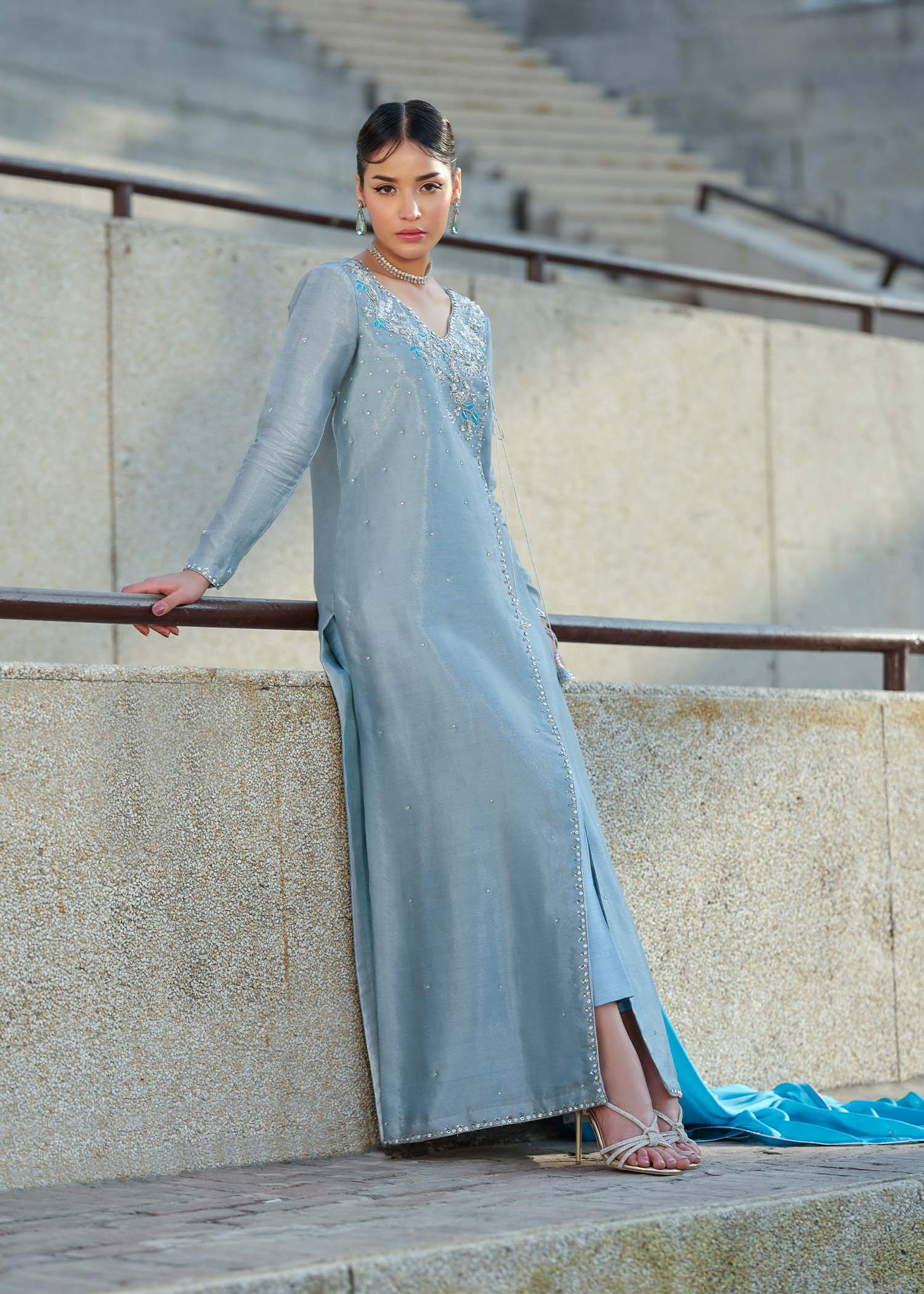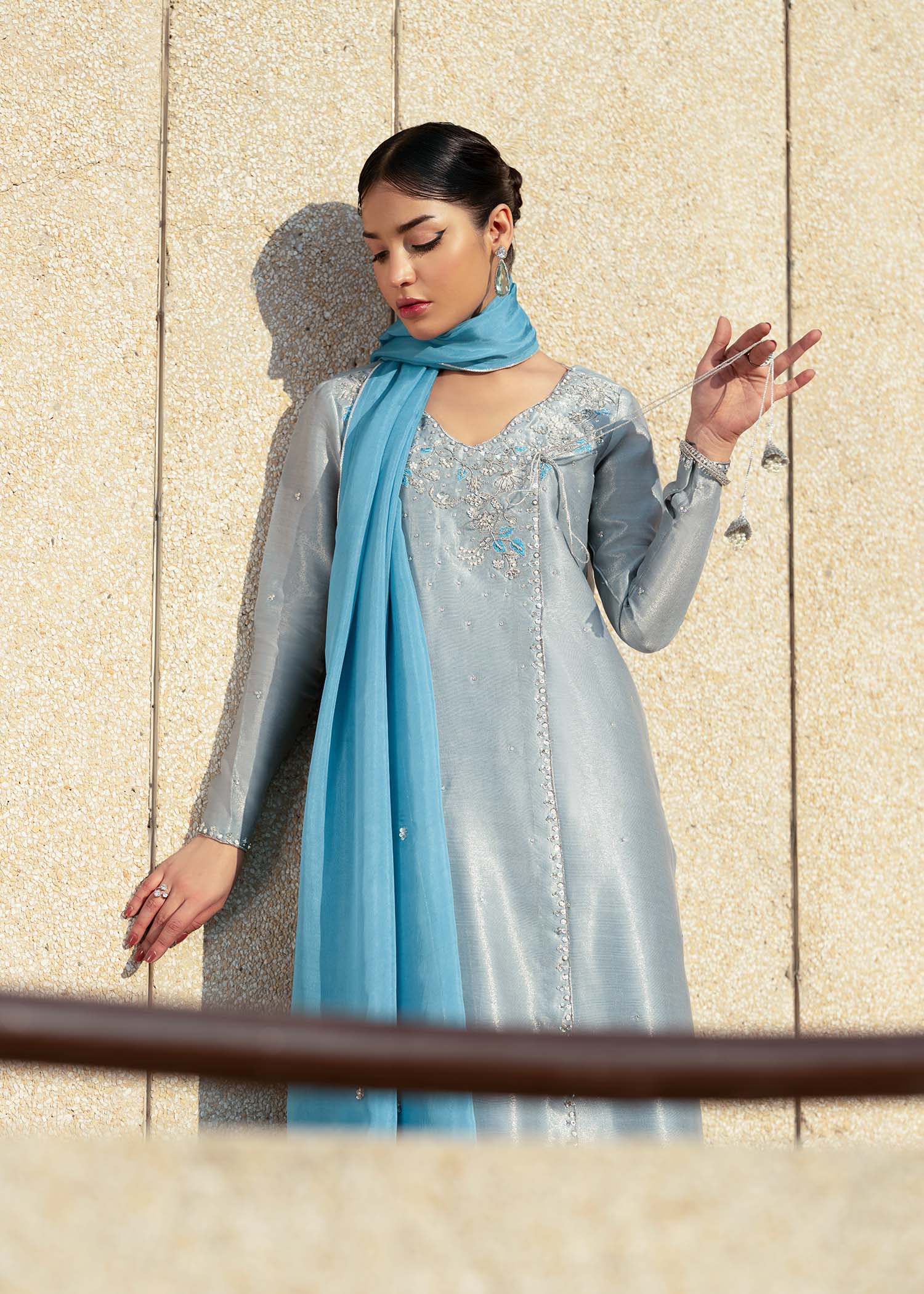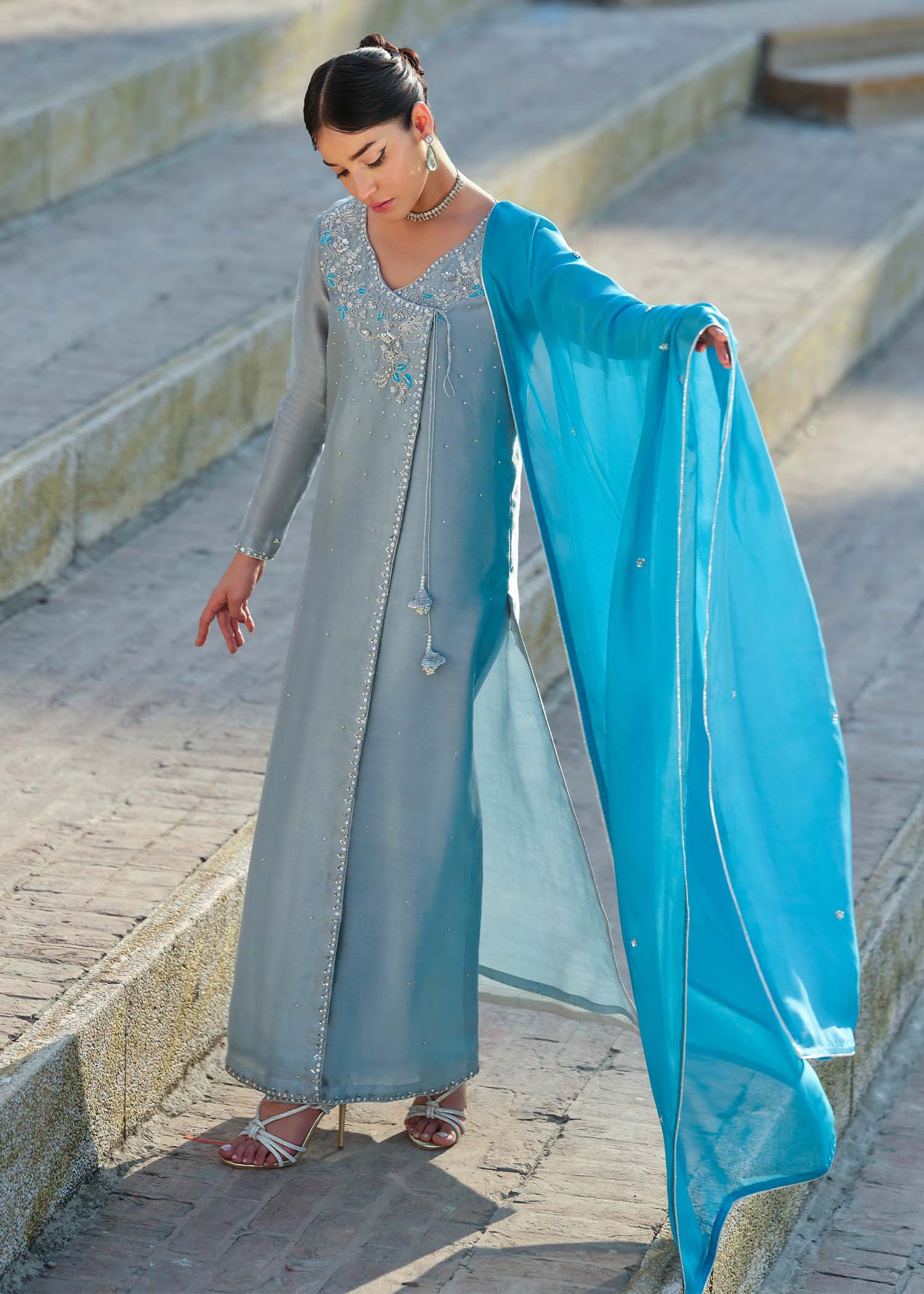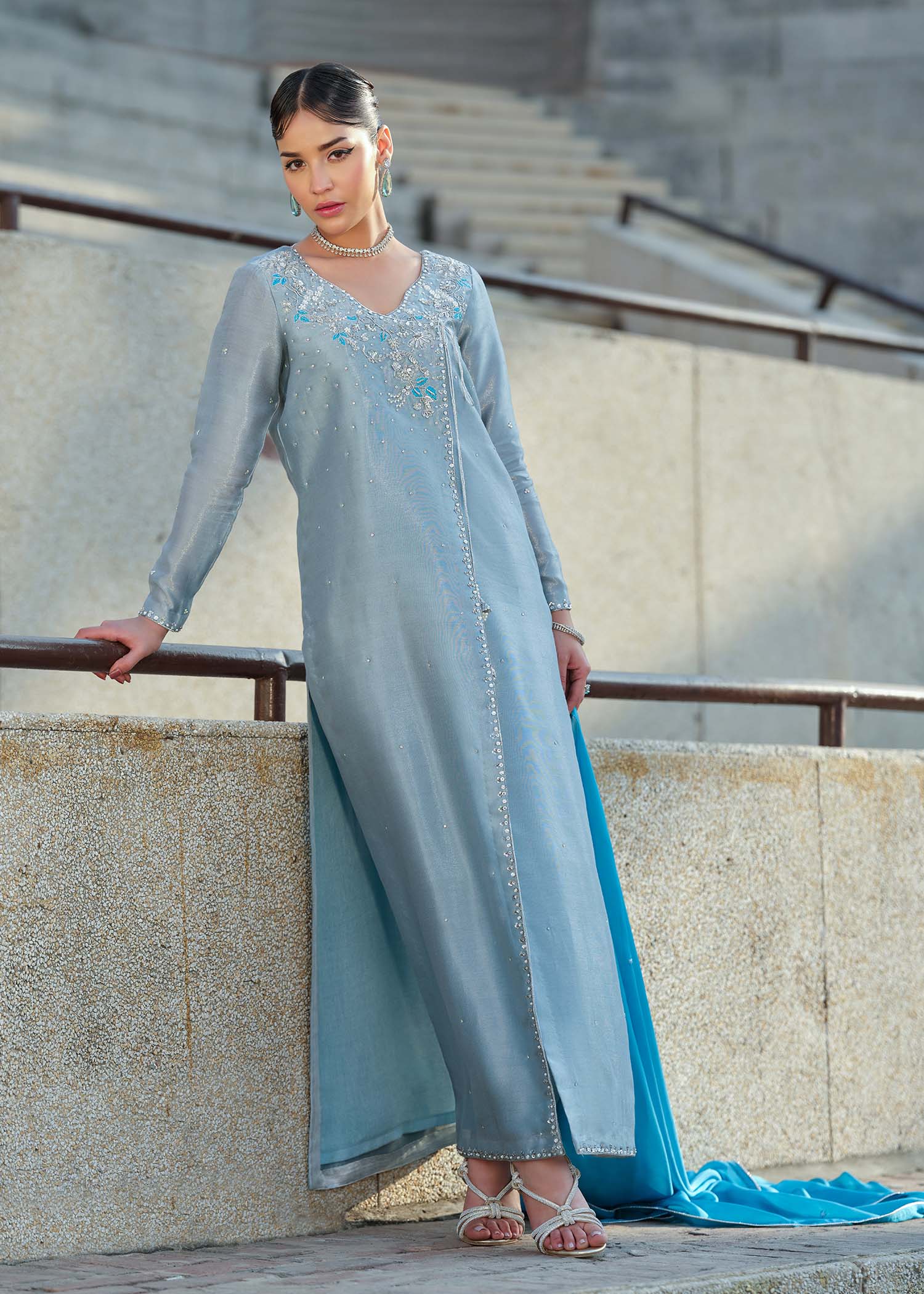 A ensemble detailed with subtle embroidery and clean tailoring. Finished with a coordinated silk dupatta, this look delivers modern sophistication. Each outfit is thoughtfully finished with a modest back neckline.