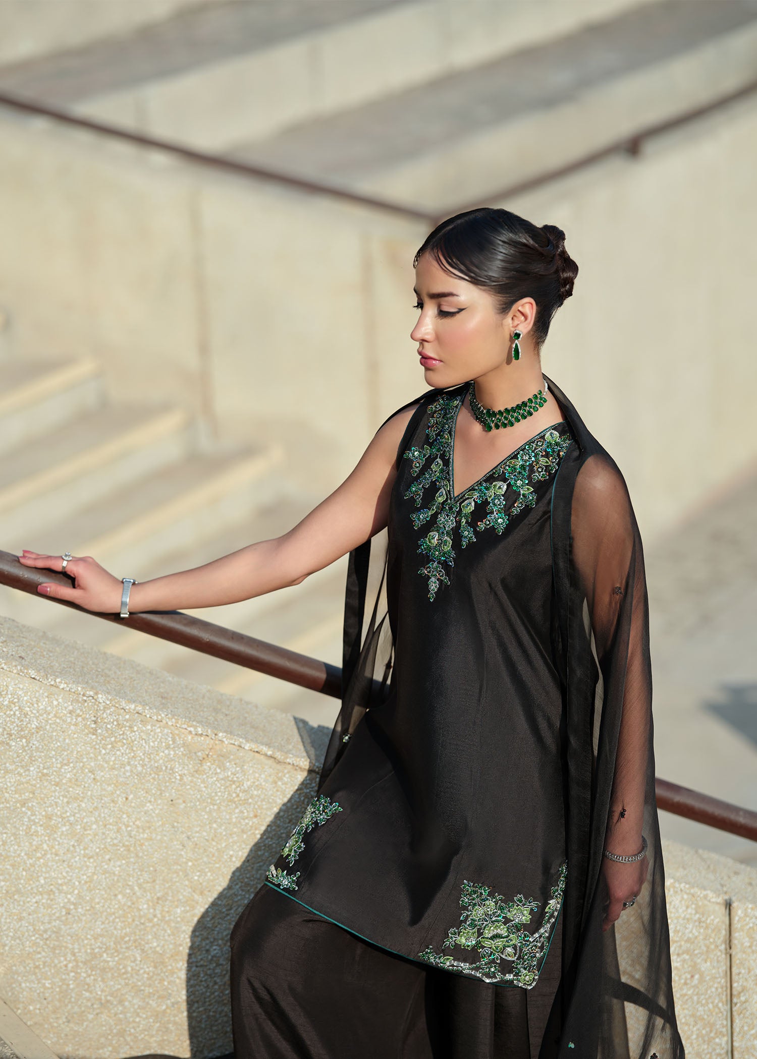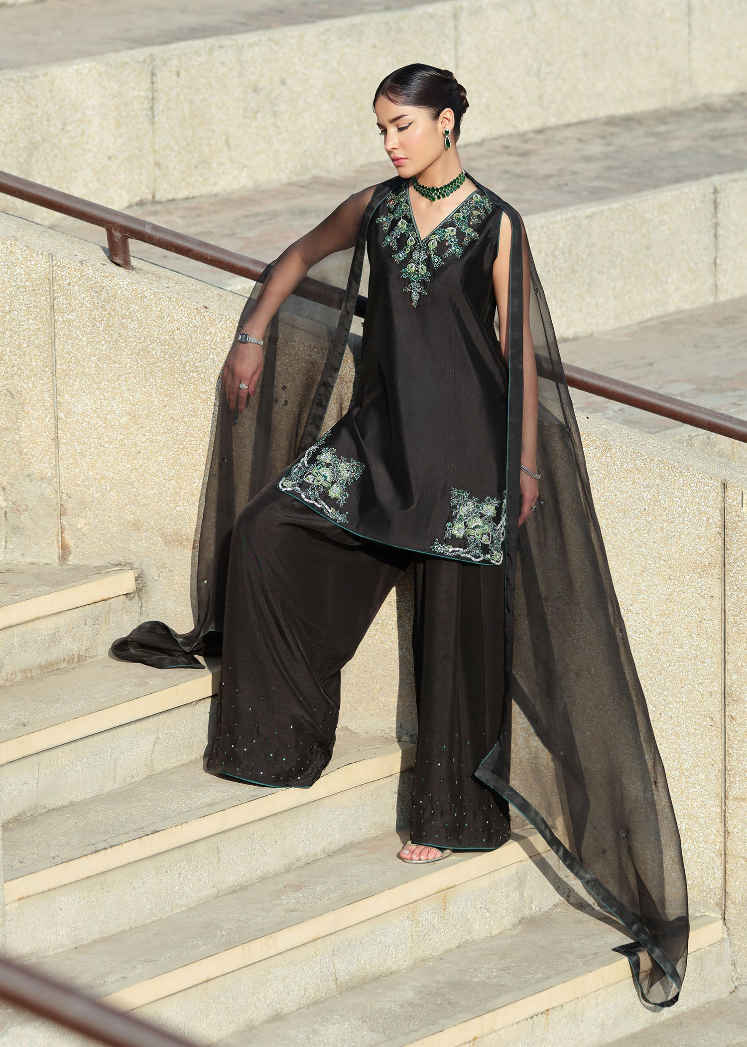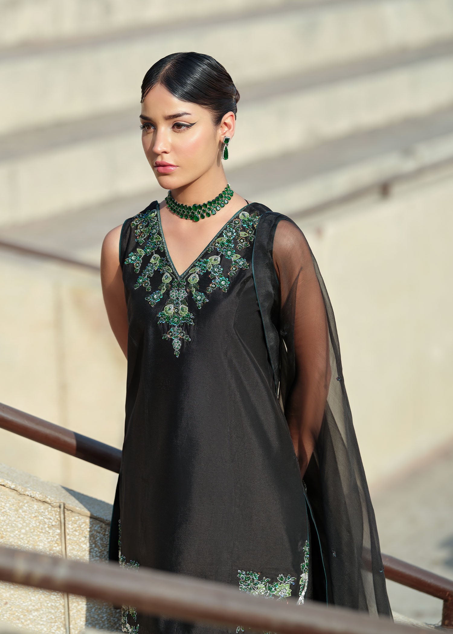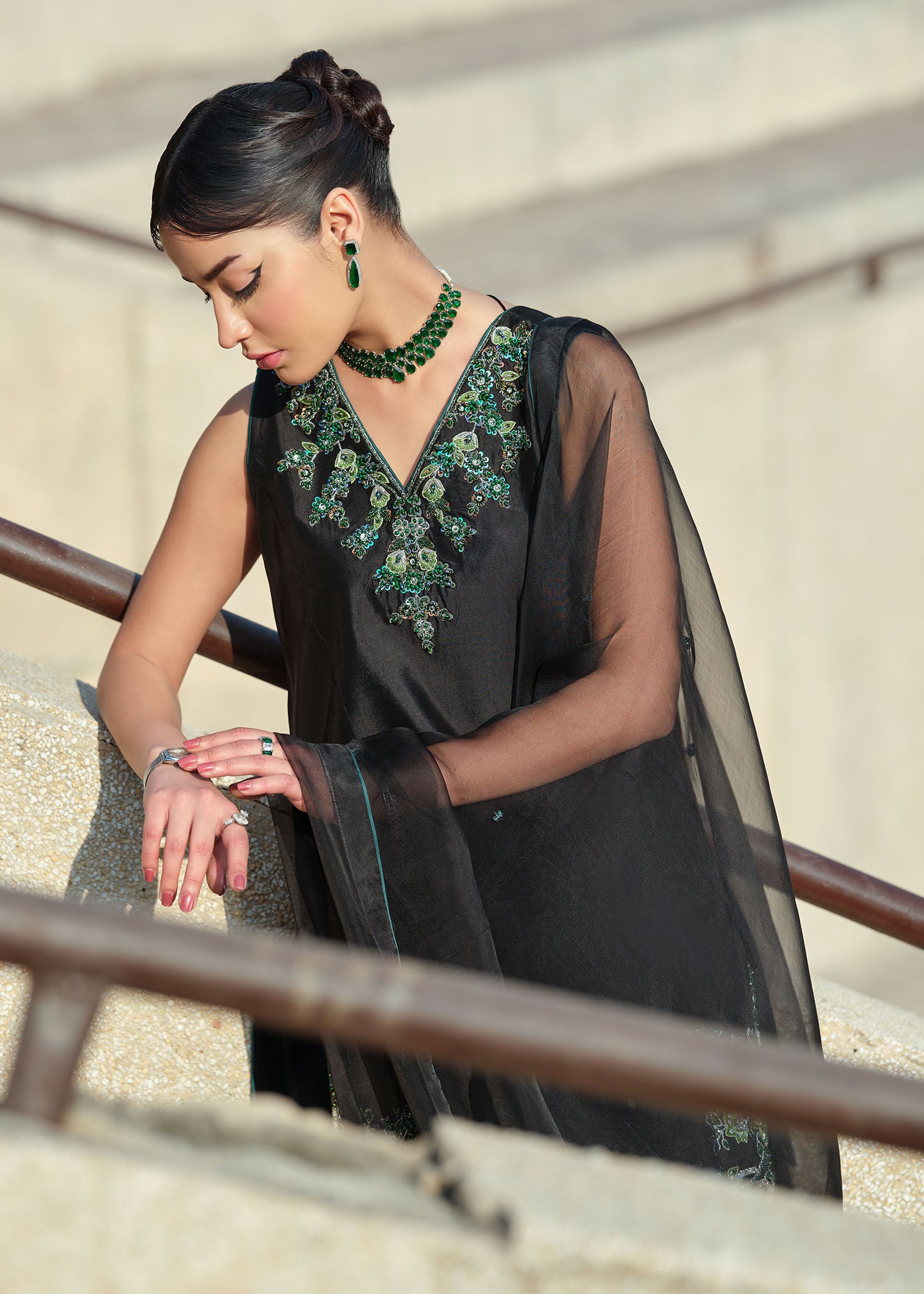 A bold black ensemble accented with emerald embroidery. The sharp silhouette is softened with a sheer organza dupatta, creating a powerful yet refined statement. The outfit comes with halter sleeveless , for a modest version you can choose sleeve. Each outfit is thoughtfully finished with a modest back neckline.