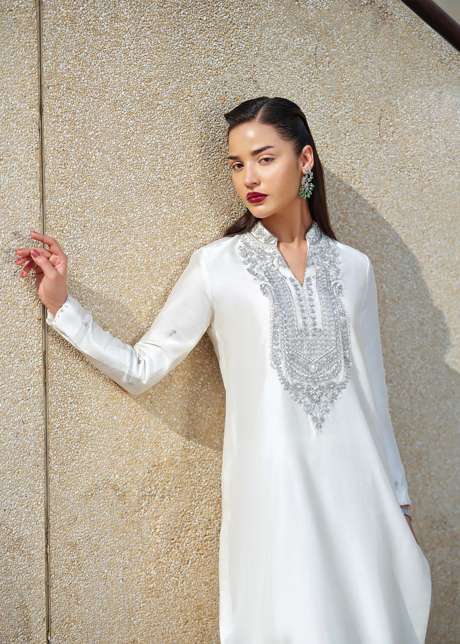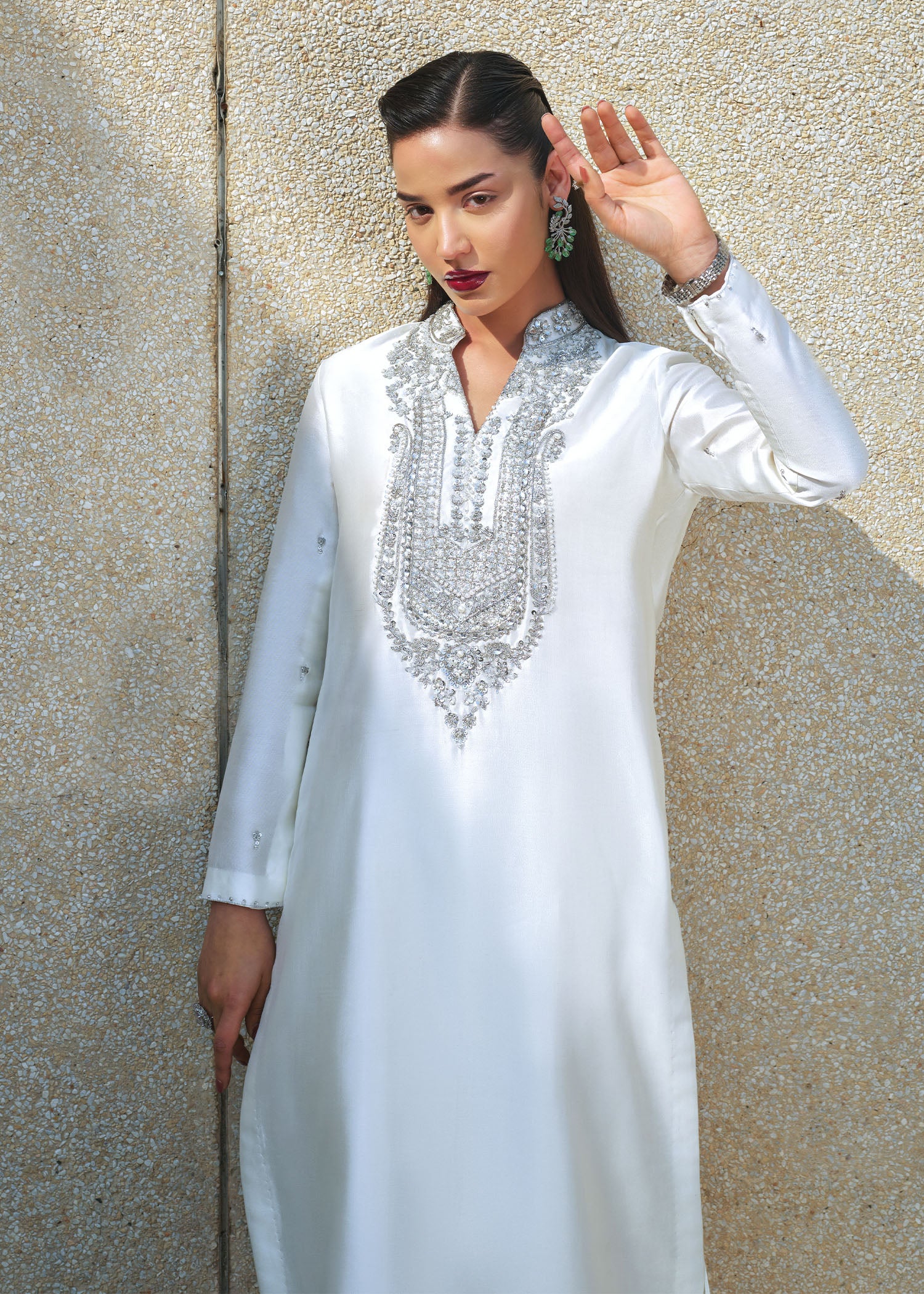 A classic white ensemble elevated with silver embroidery. Clean lines and a structured shirt create a polished and versatile luxury look.