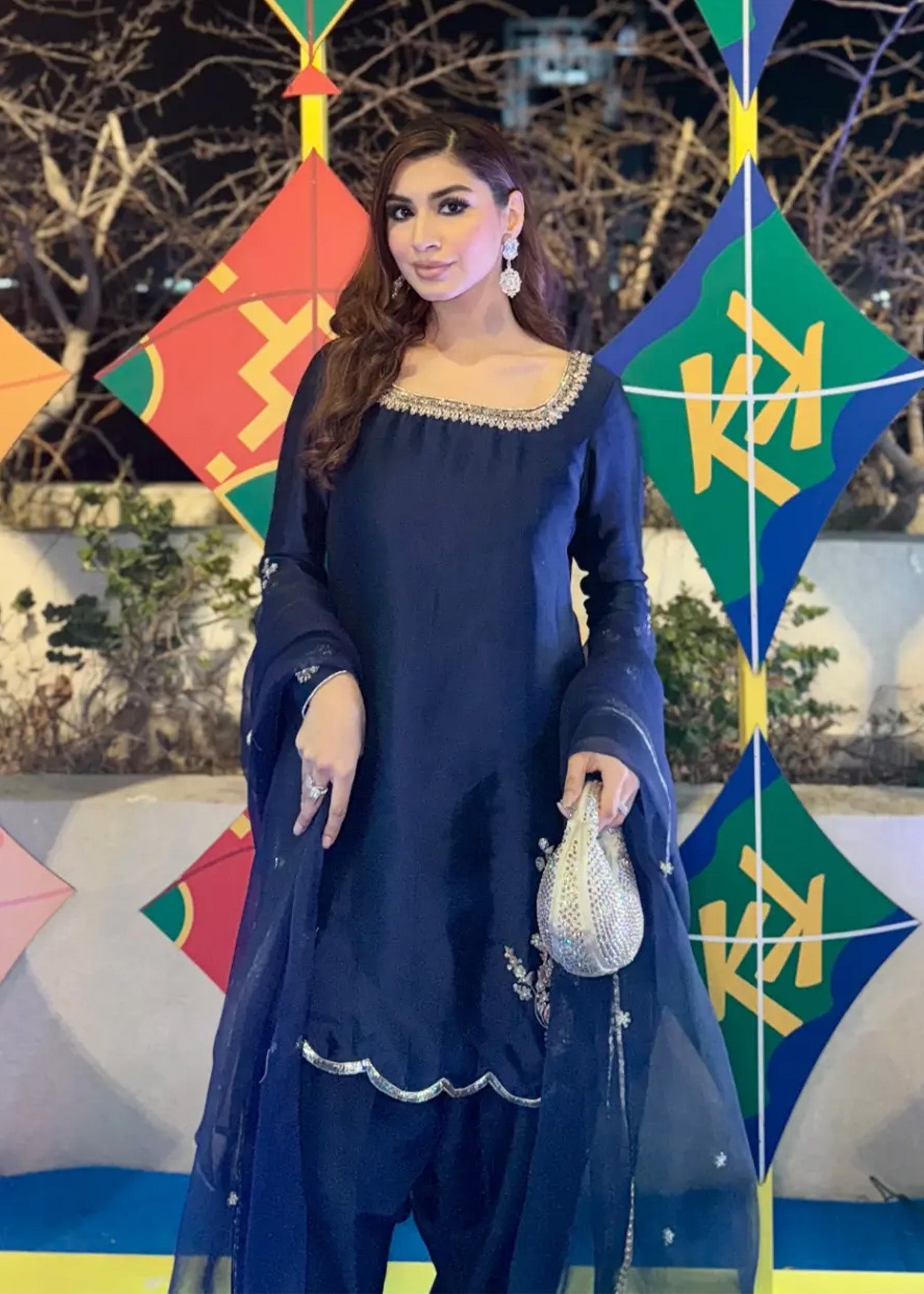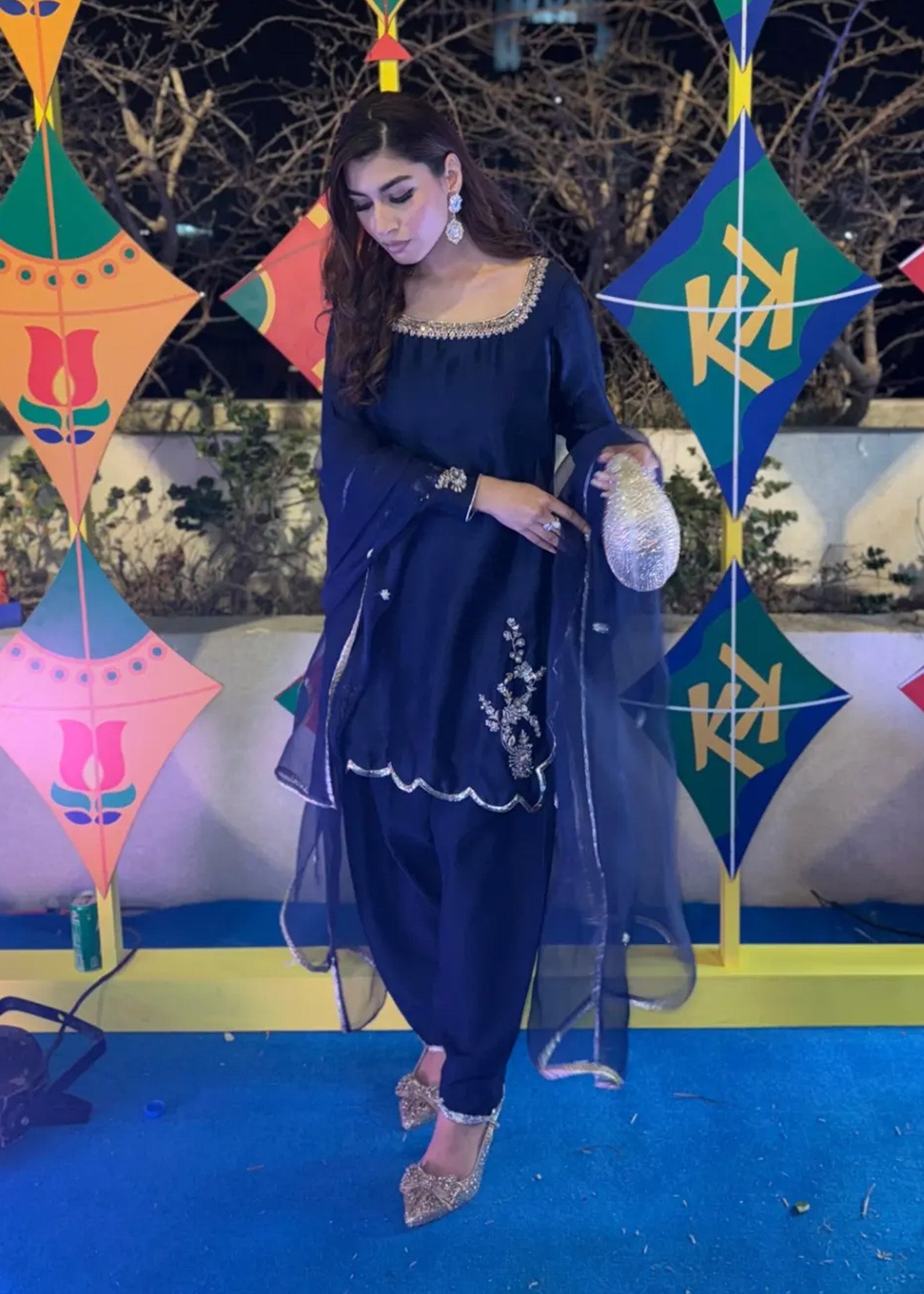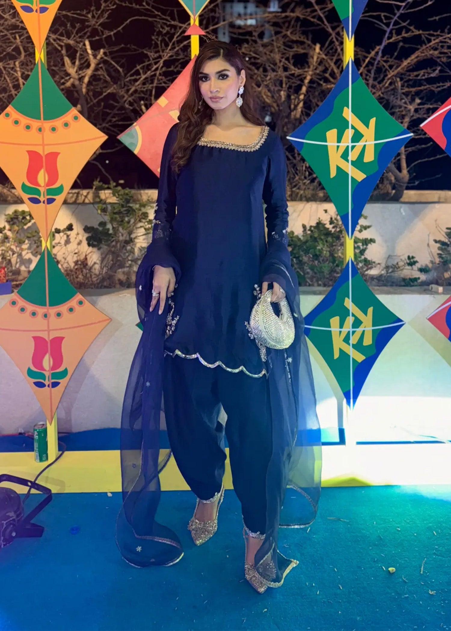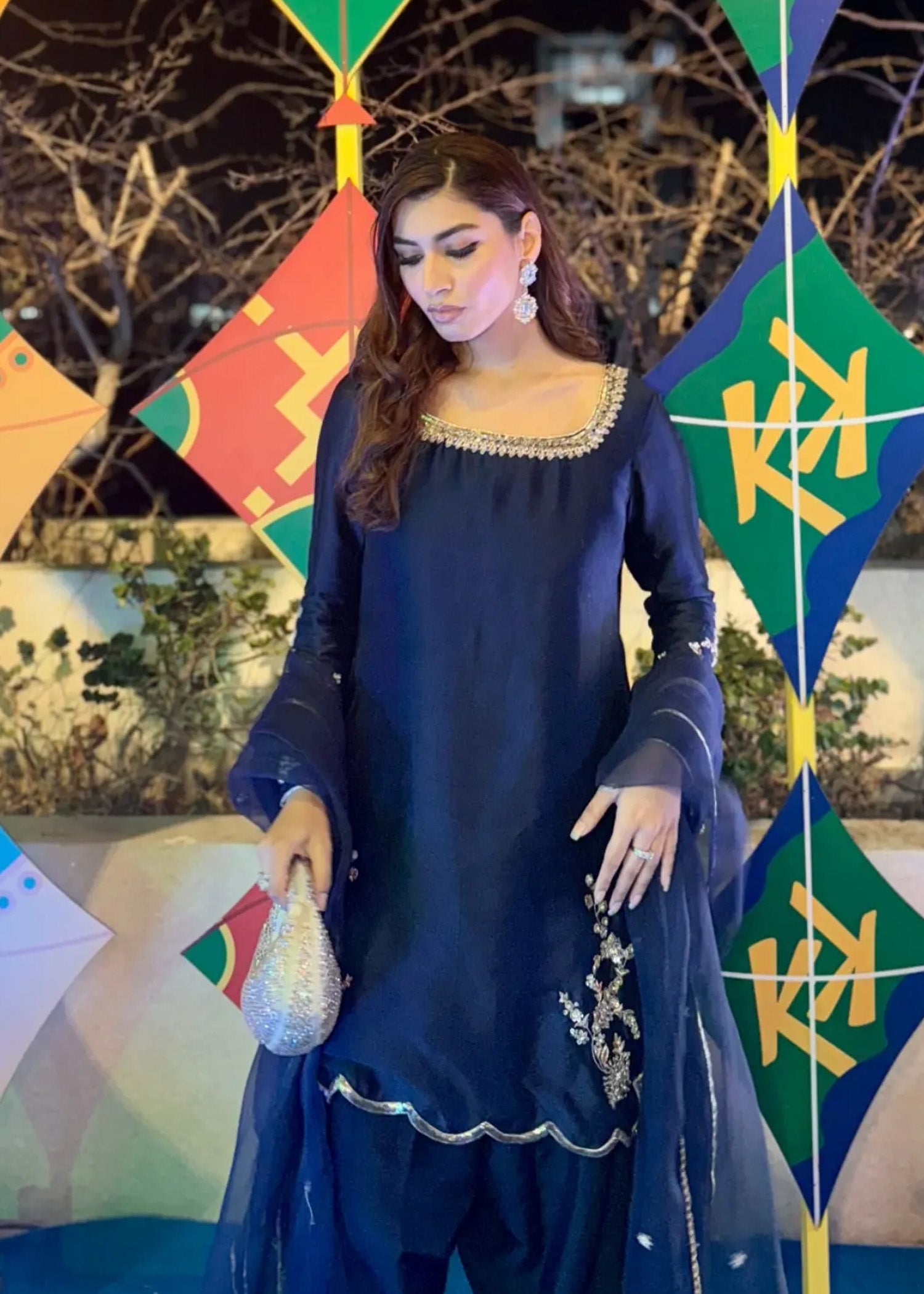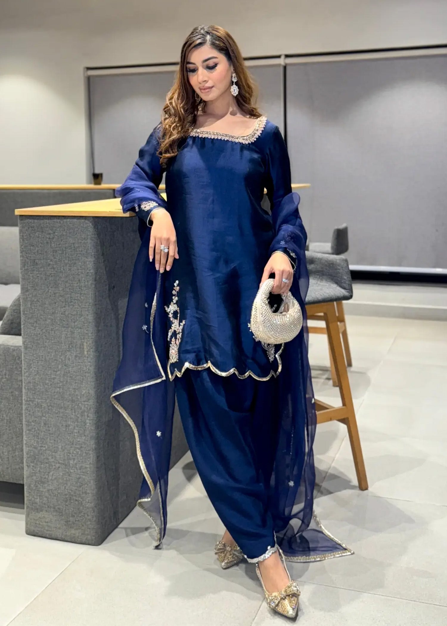 "Diva" is a chic, minimalist silhouette with intricate Ganga Jamni work at the front, featuring a khari shalwar with scalloped finishing. It's paired with an elegant organza dupatta, beautifully adorned with delicate booti work, creating a refined and stylish ensemble.